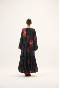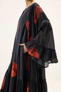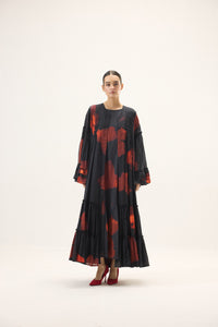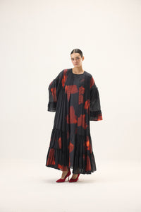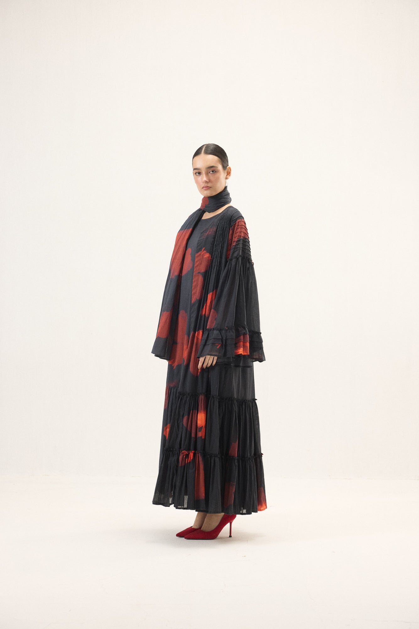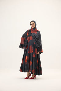 Crafted in soft cotton mul, this abaya features vivid rouge-red abstract florals set against a black base, flowing gracefully across a fluid silhouette. Pintuck details add subtle texture, while gathered panels and frilled sleeves create gentle movement. Thoughtfully designed with side pockets, it comes with a matching inner dress and scarf, offering a look that is effortless, modern, and quietly striking.