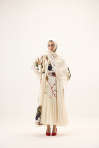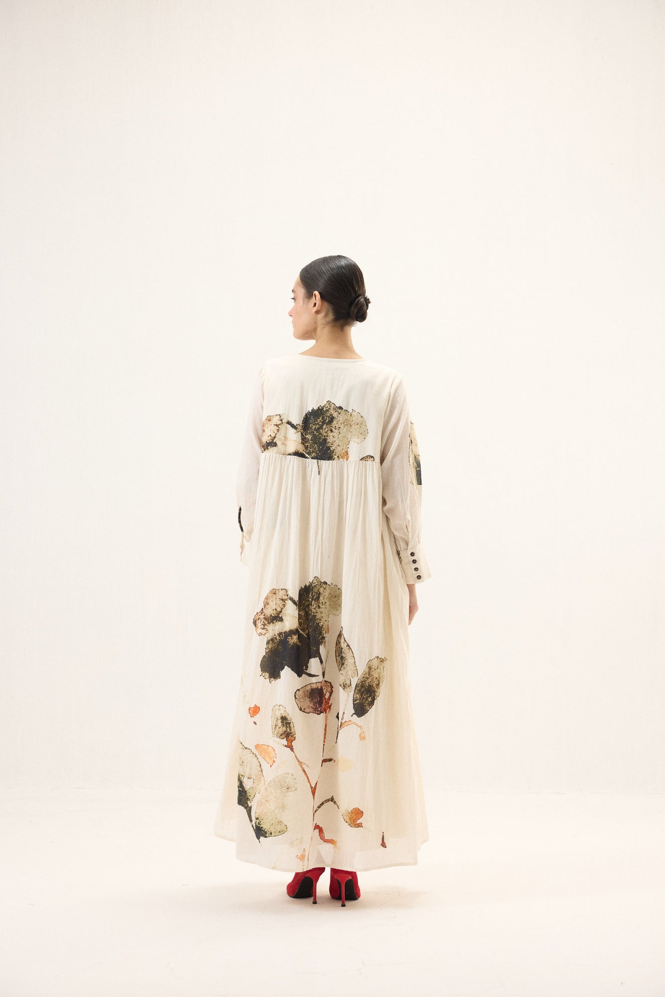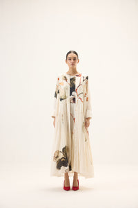 Crafted in soft, breathable cotton mul, this set features painterly florals scattered across a gentle ivory base, flows in an easy, gathered silhouette, detailed with softly structured cuffs and functional side pockets. Paired with a matching inner dress and scarf, the set feels light, fluid, and quietly expressive and designed for comfort, movement, and everyday elegance.