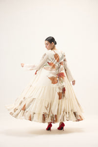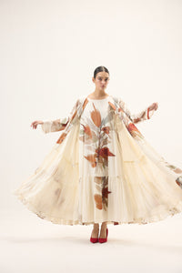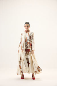 Crafted in soft cotton mul, this abaya set in off-white adorns floral art print across a flowy silhouette. Gathered panels at the bottom add gentle volume, while side pockets bring practical ease. Paired with a matching inner dress and scarf, it is an effortlessly graceful ensemble, quietly striking, comfortable, and timeless.