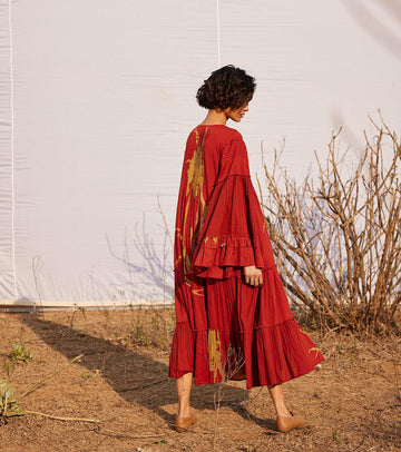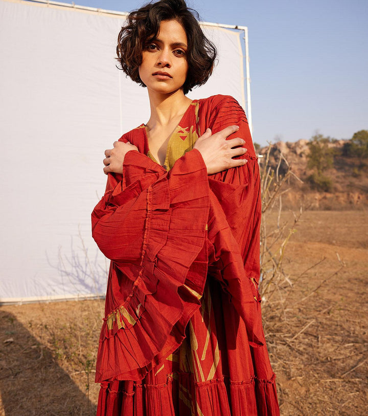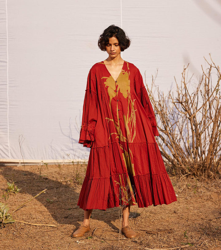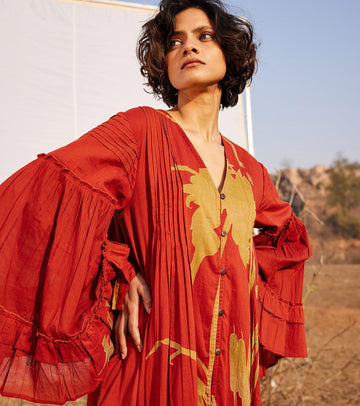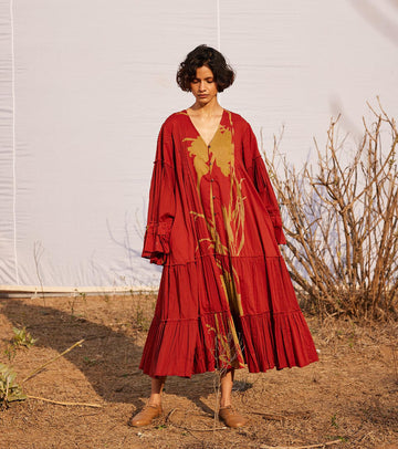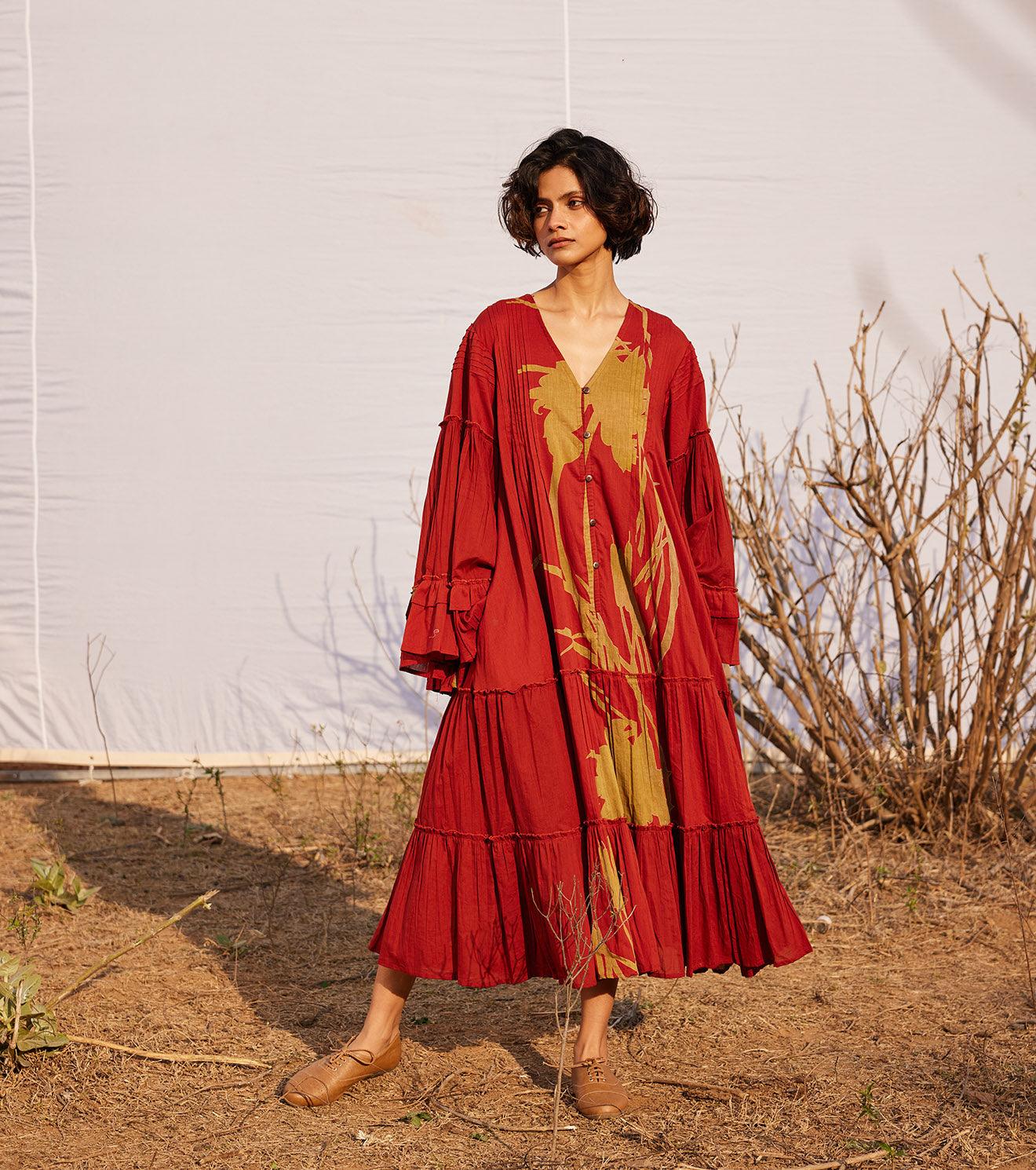 A Voluminous brick red dress, crafted from breathable soft cotton mul fabric. adorned with a delicate floral print. featuring flared sleeves.
