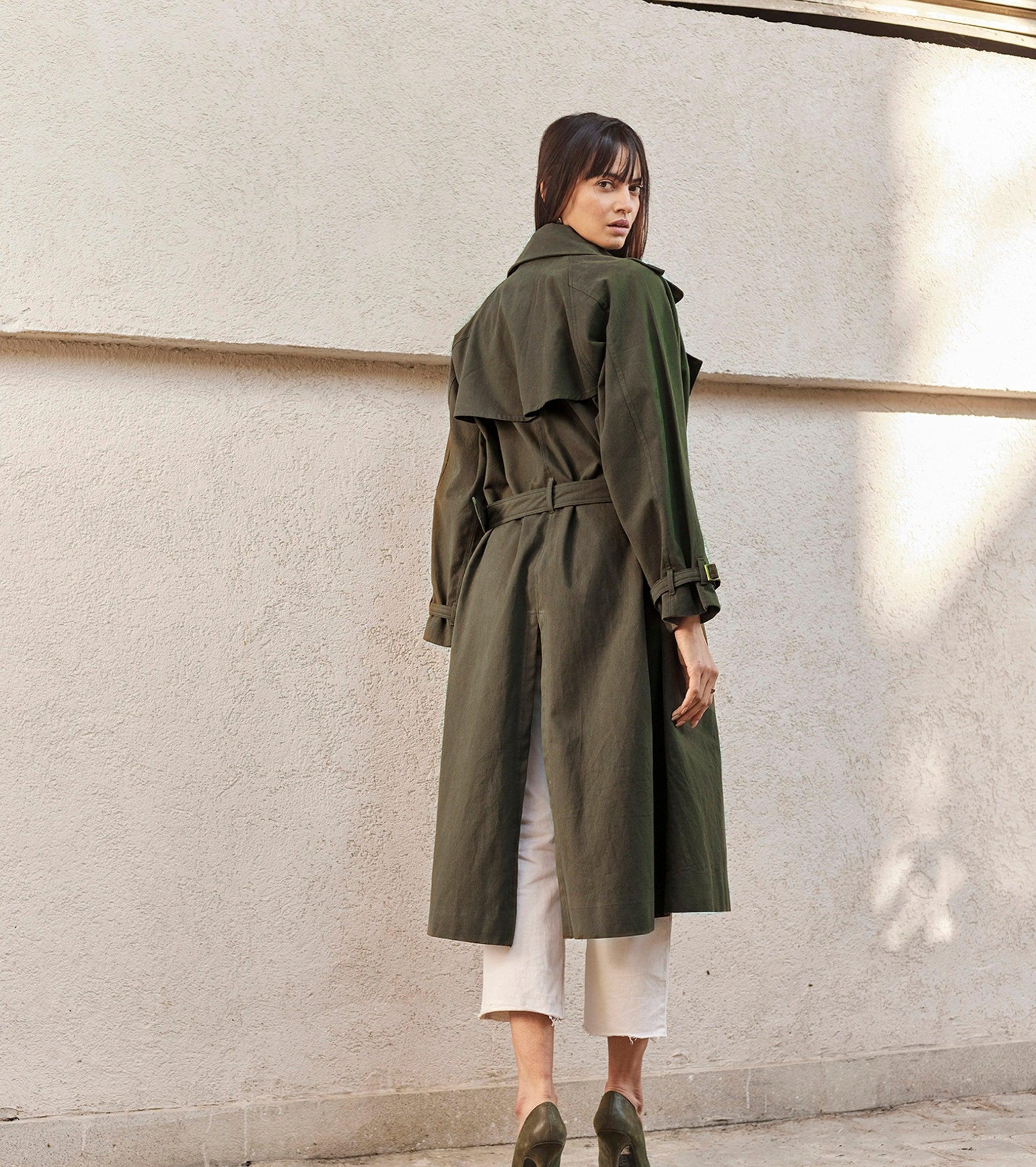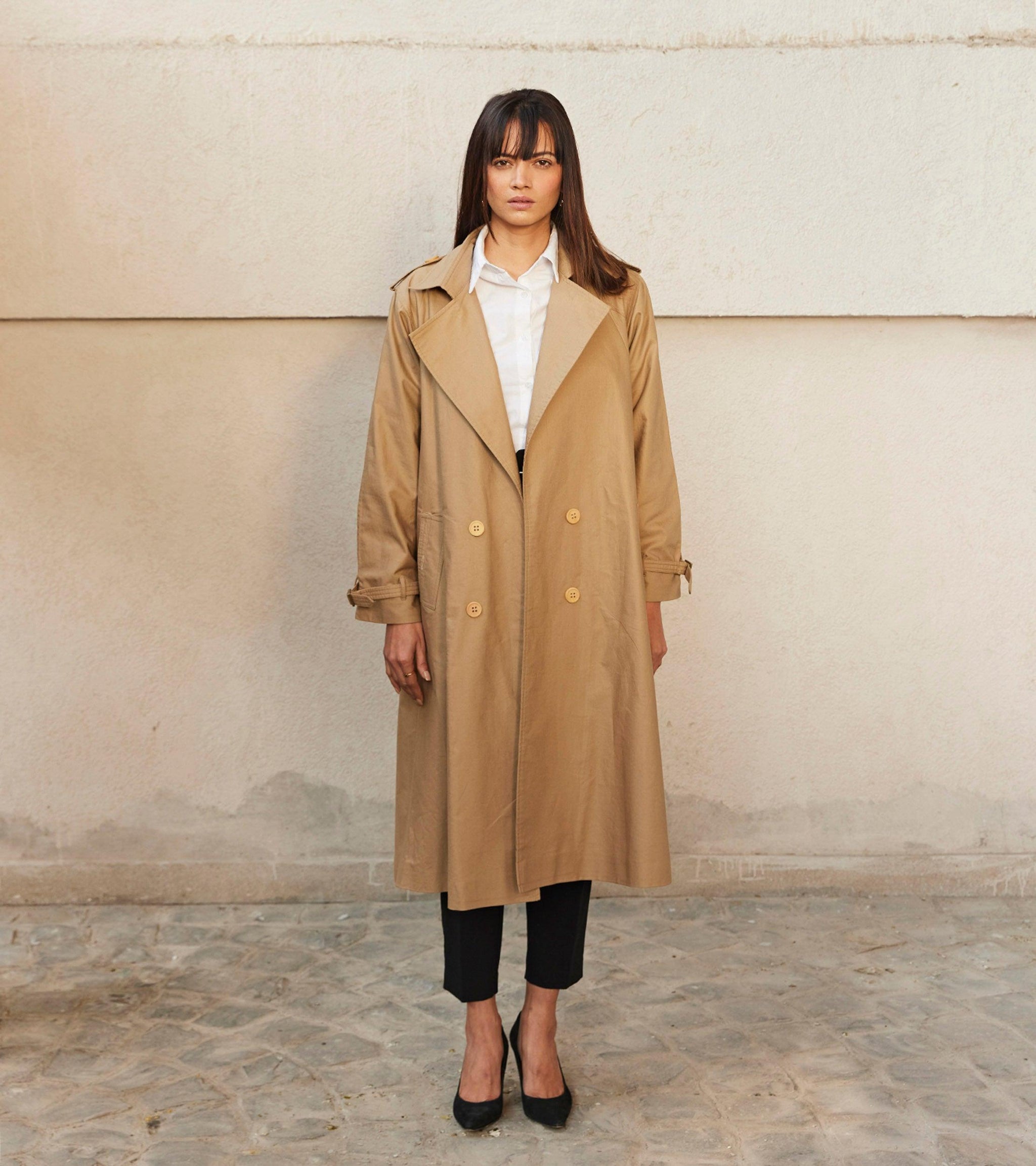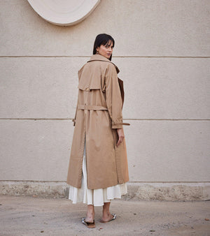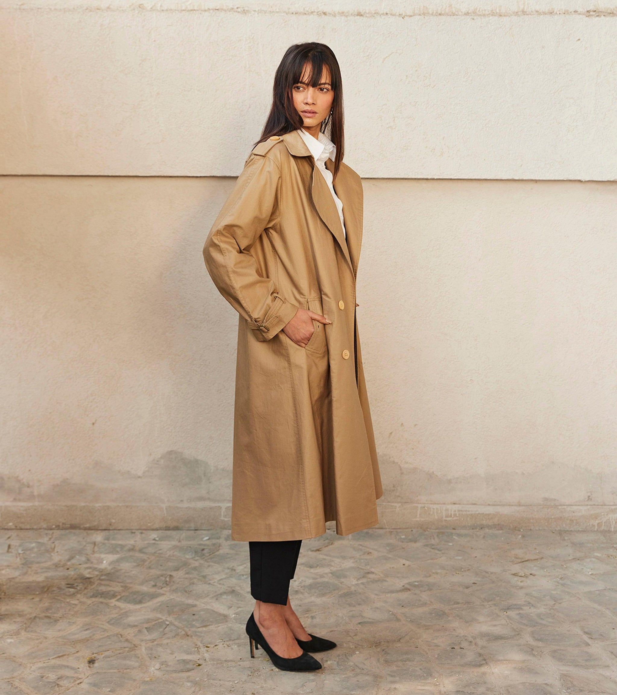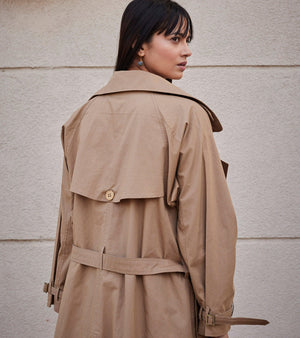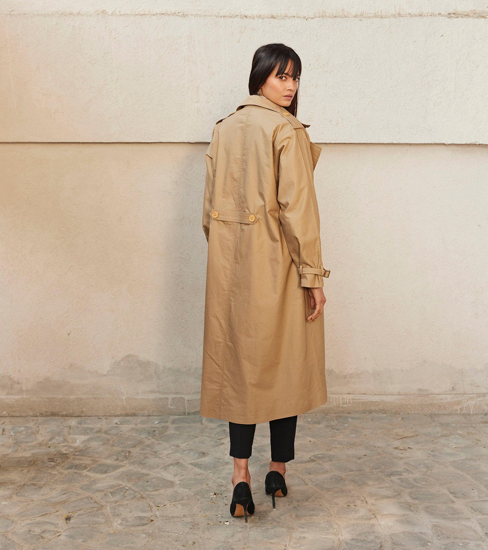 A double-breasted classic trench coat with buttoned epaulettes, bracelet cuffs and button pockets.