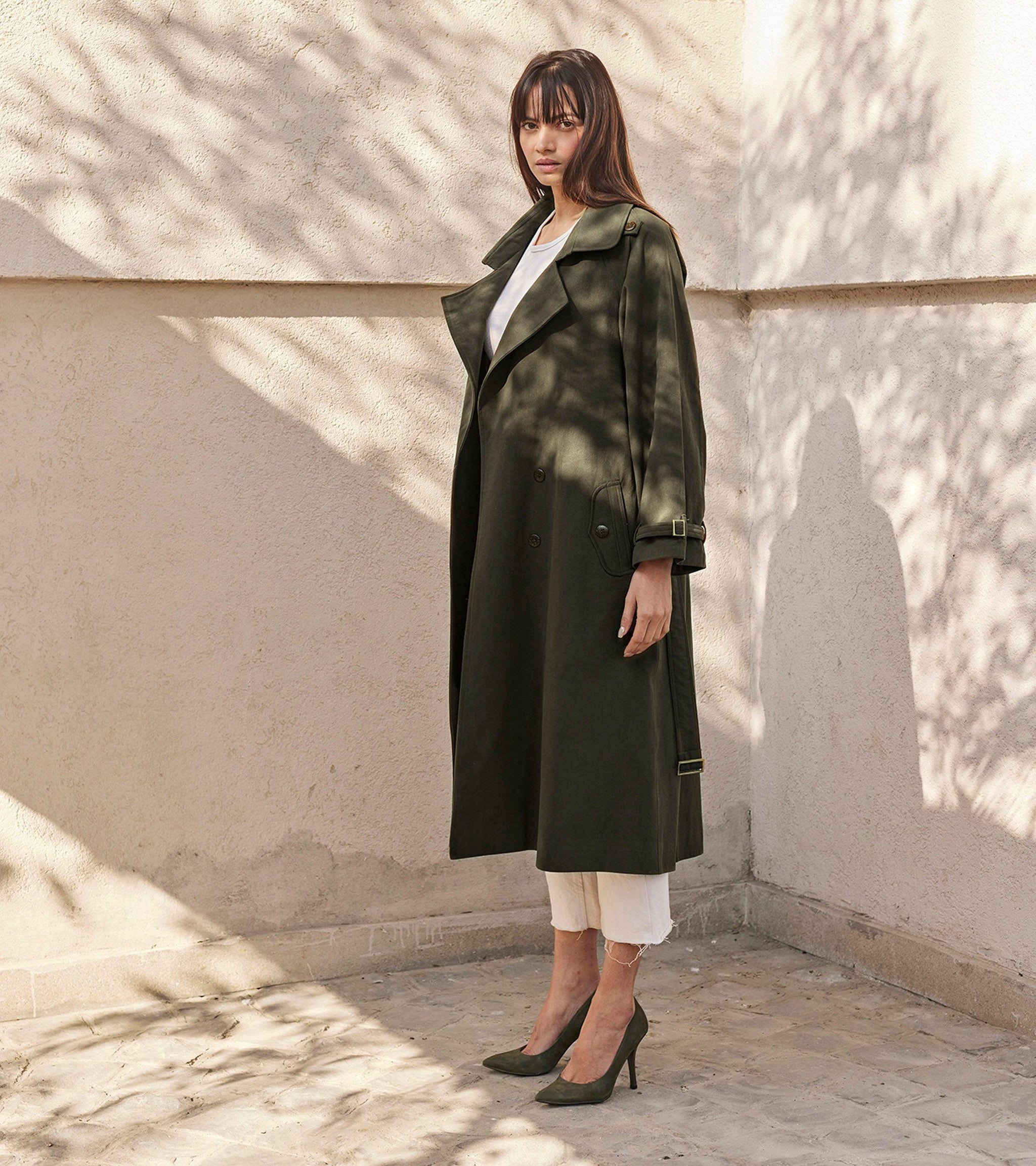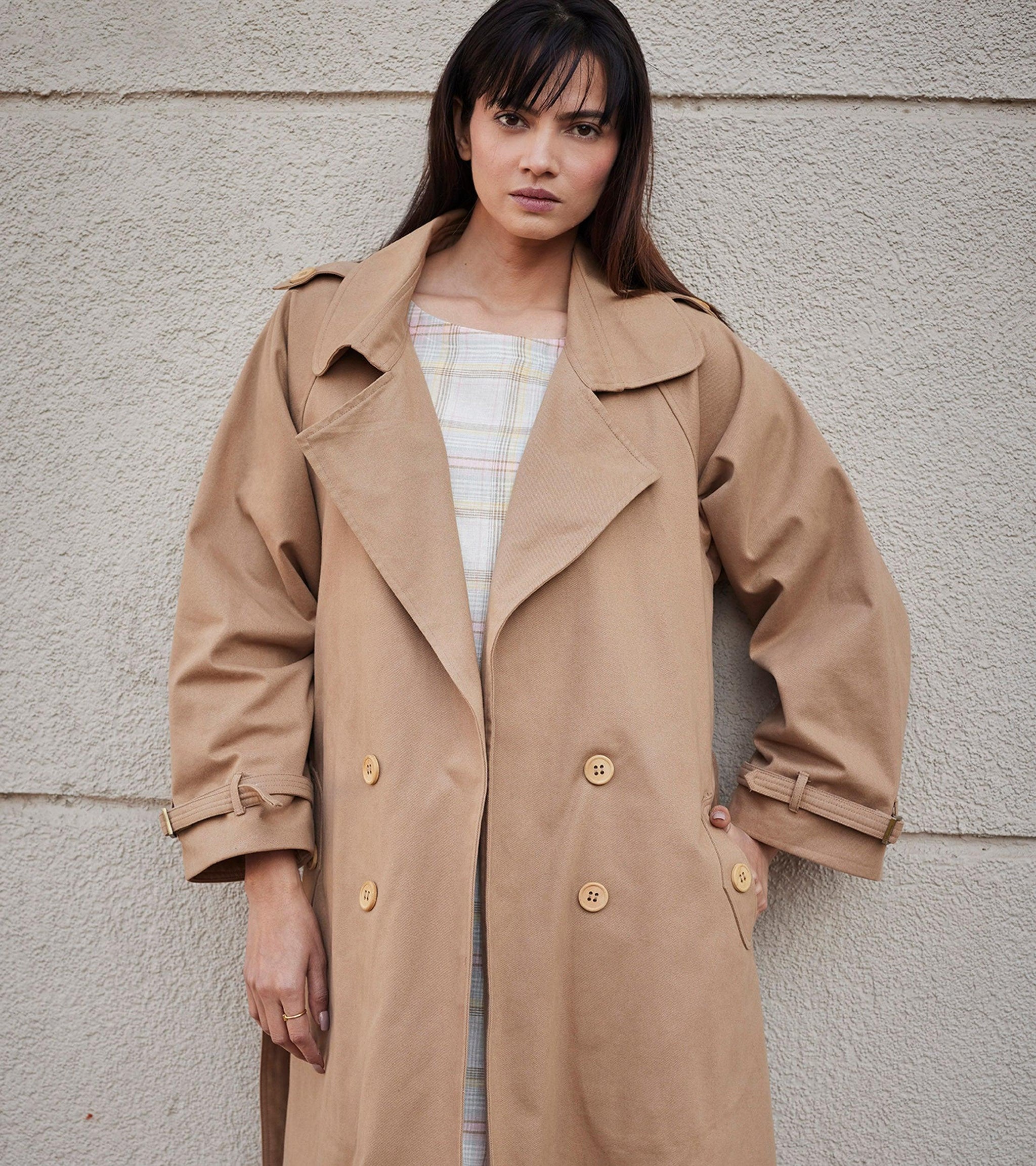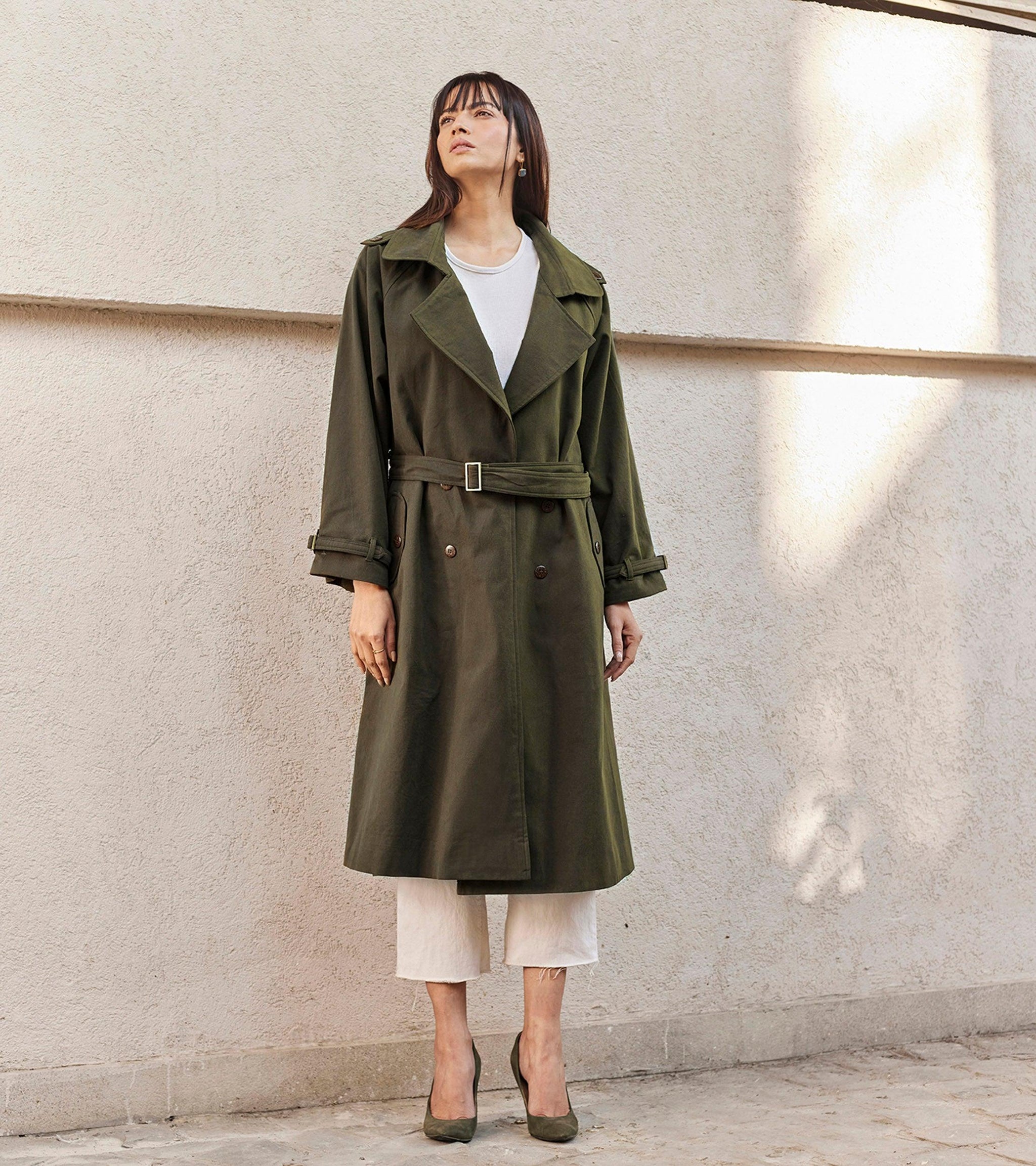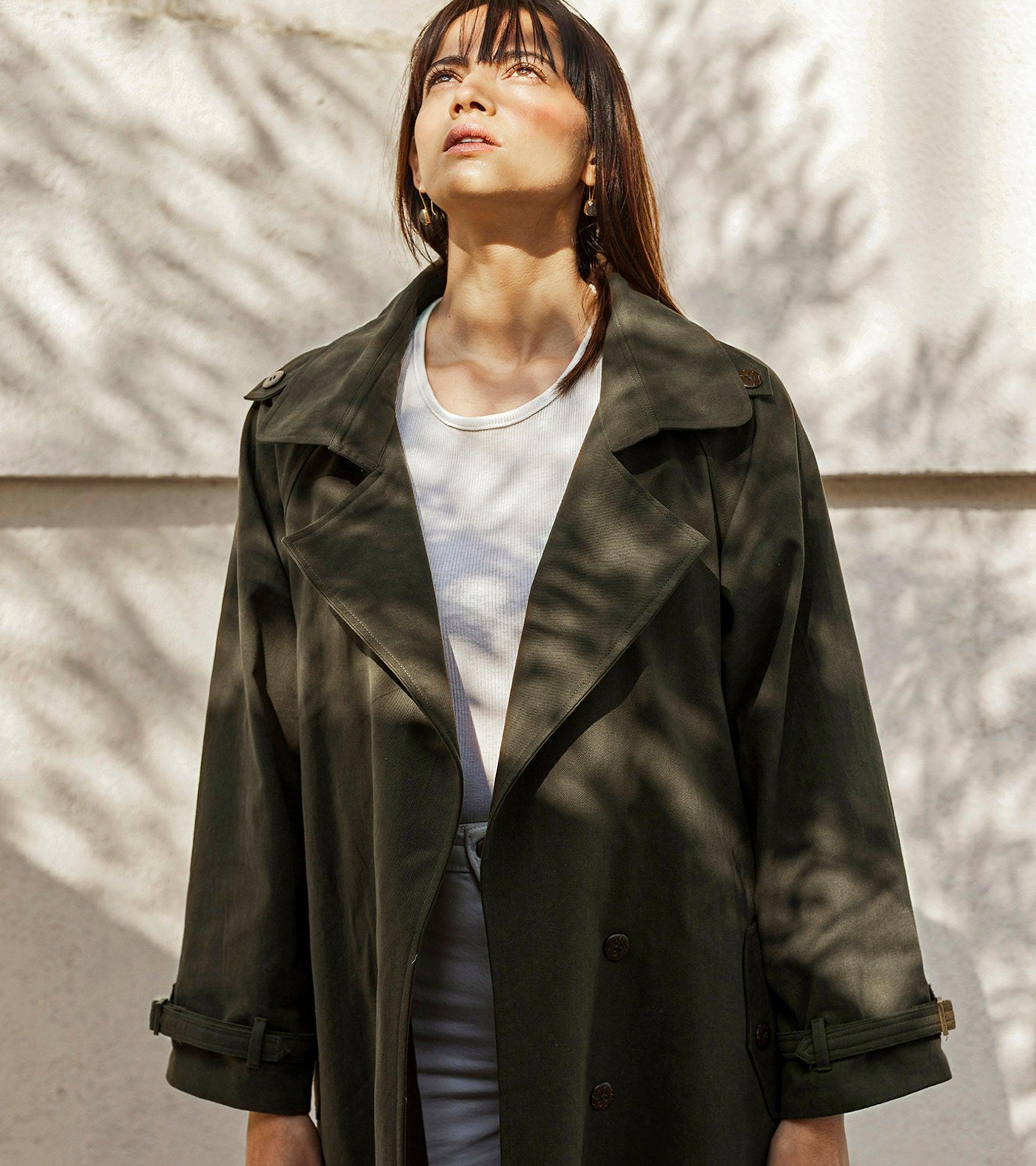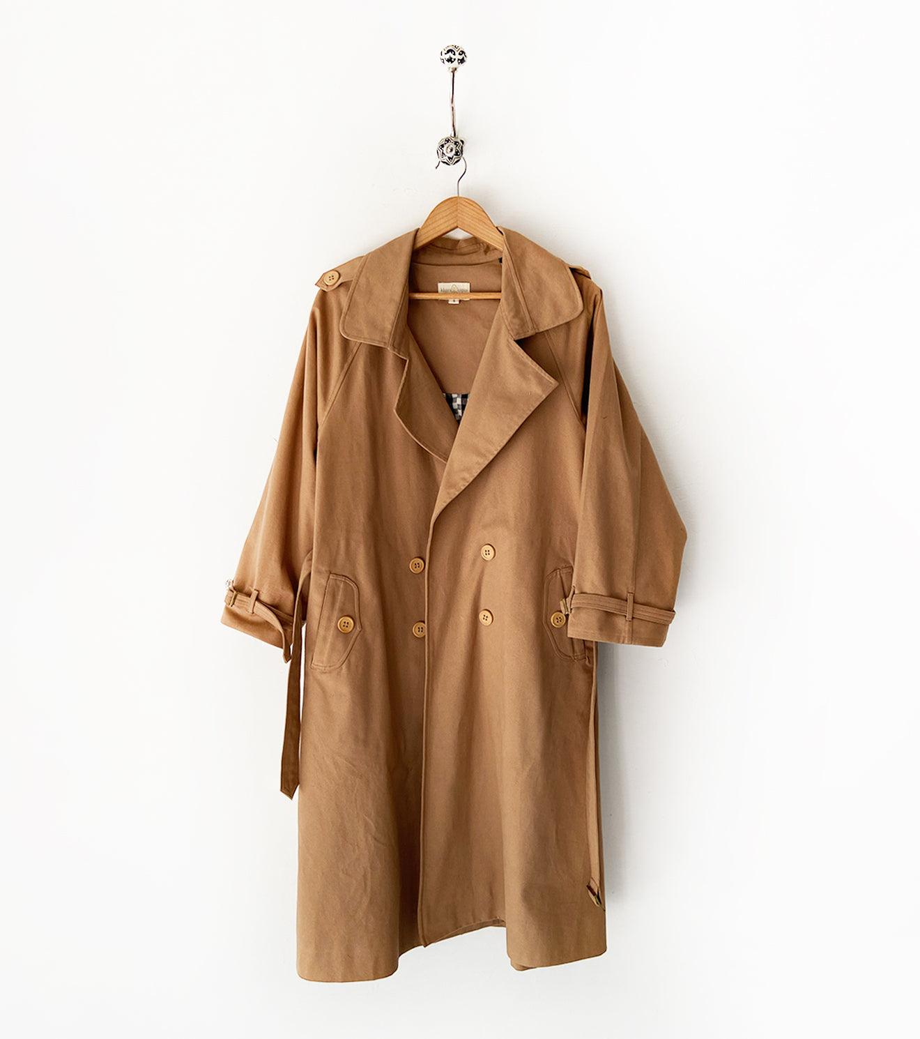 A double-breasted classic trench coat with buttoned epaulettes, bracelet cuffs and button pockets.