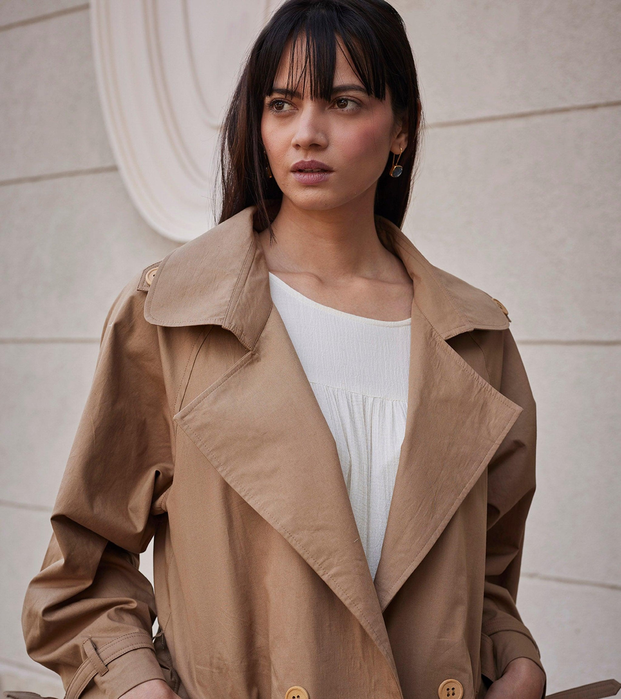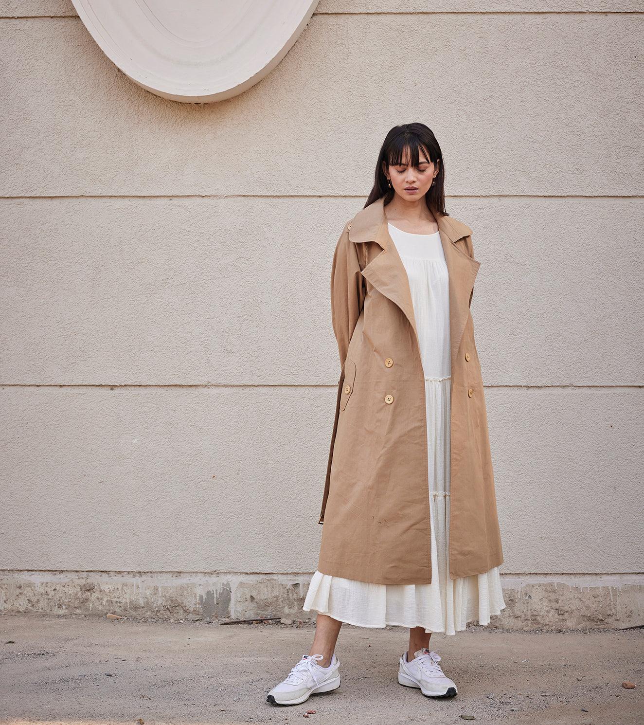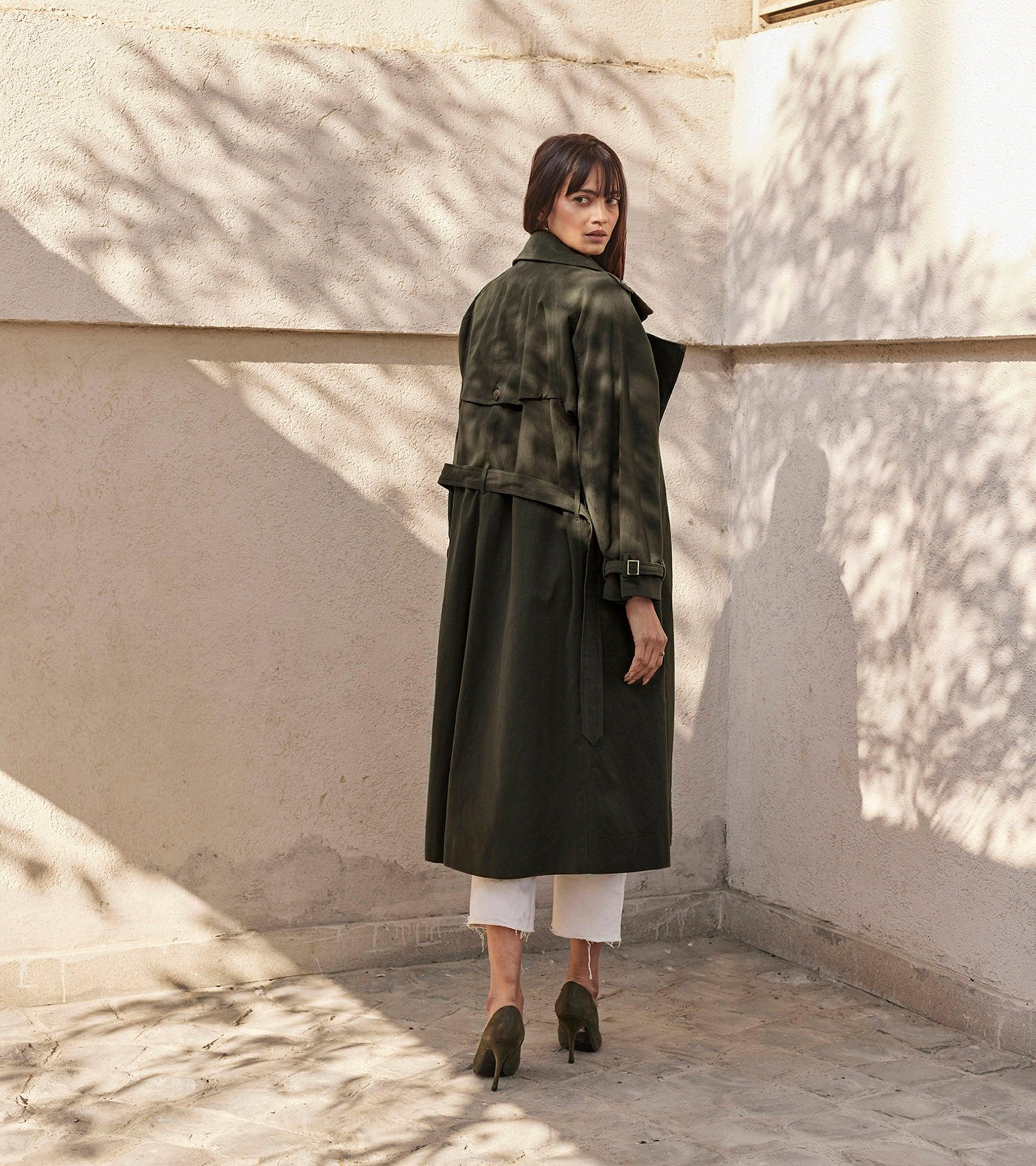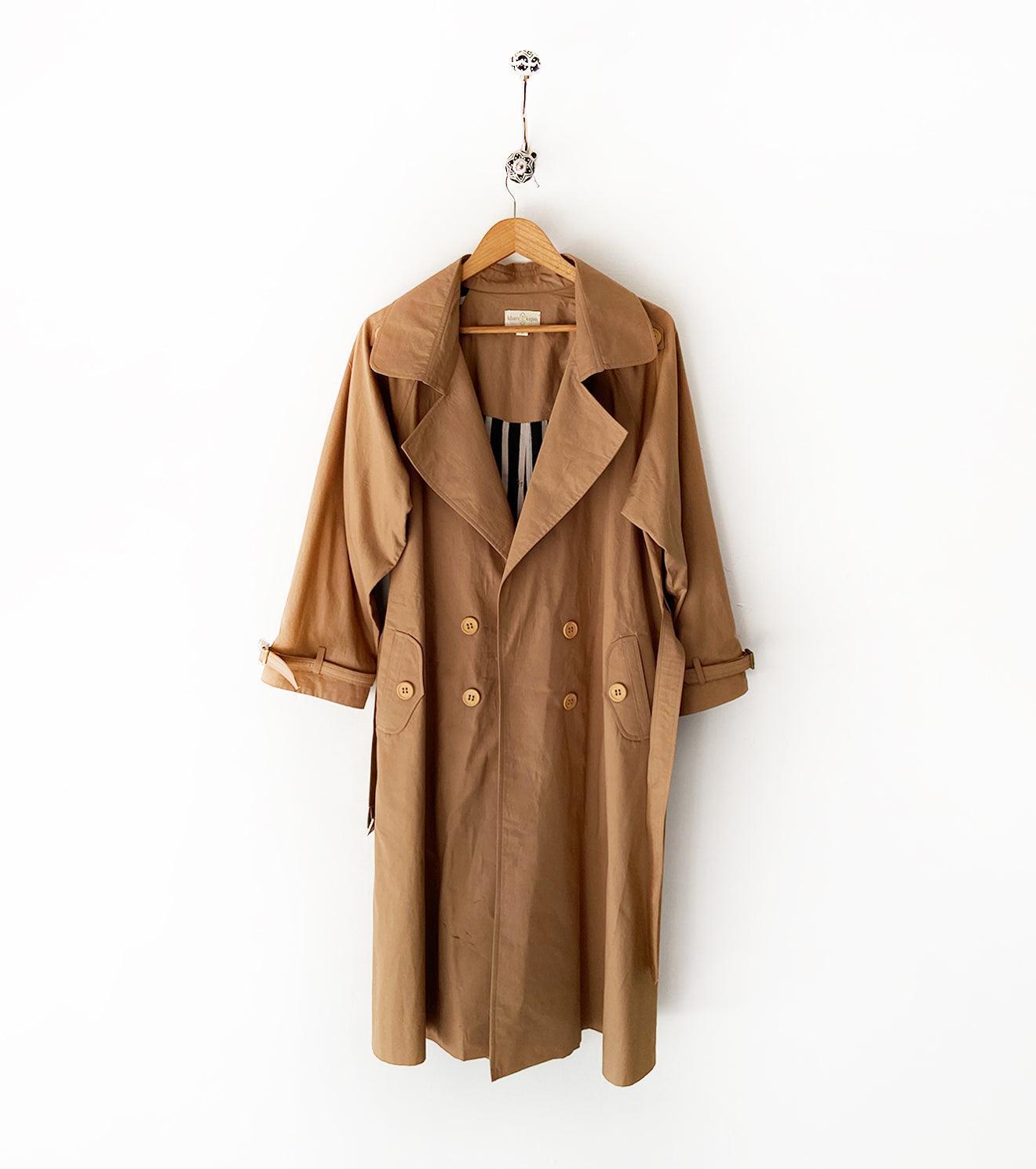 A double-breasted classic trench coat with buttoned epaulettes, bracelet cuffs and button pockets.