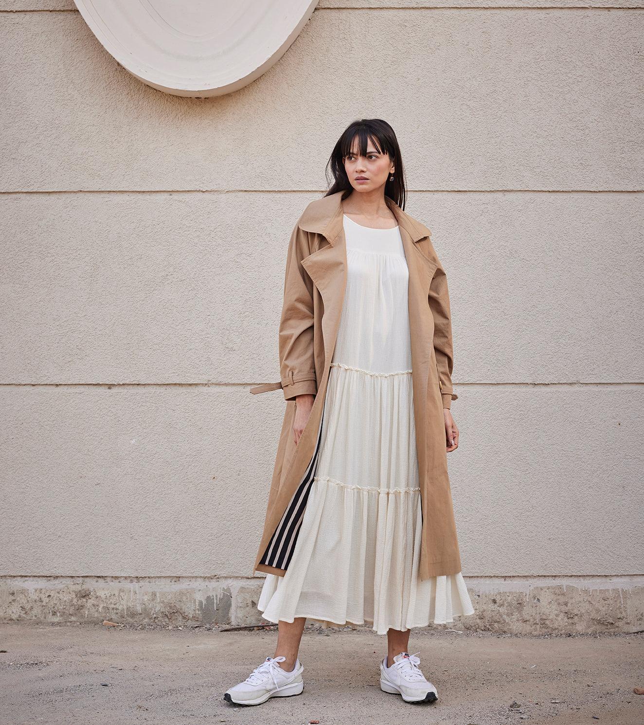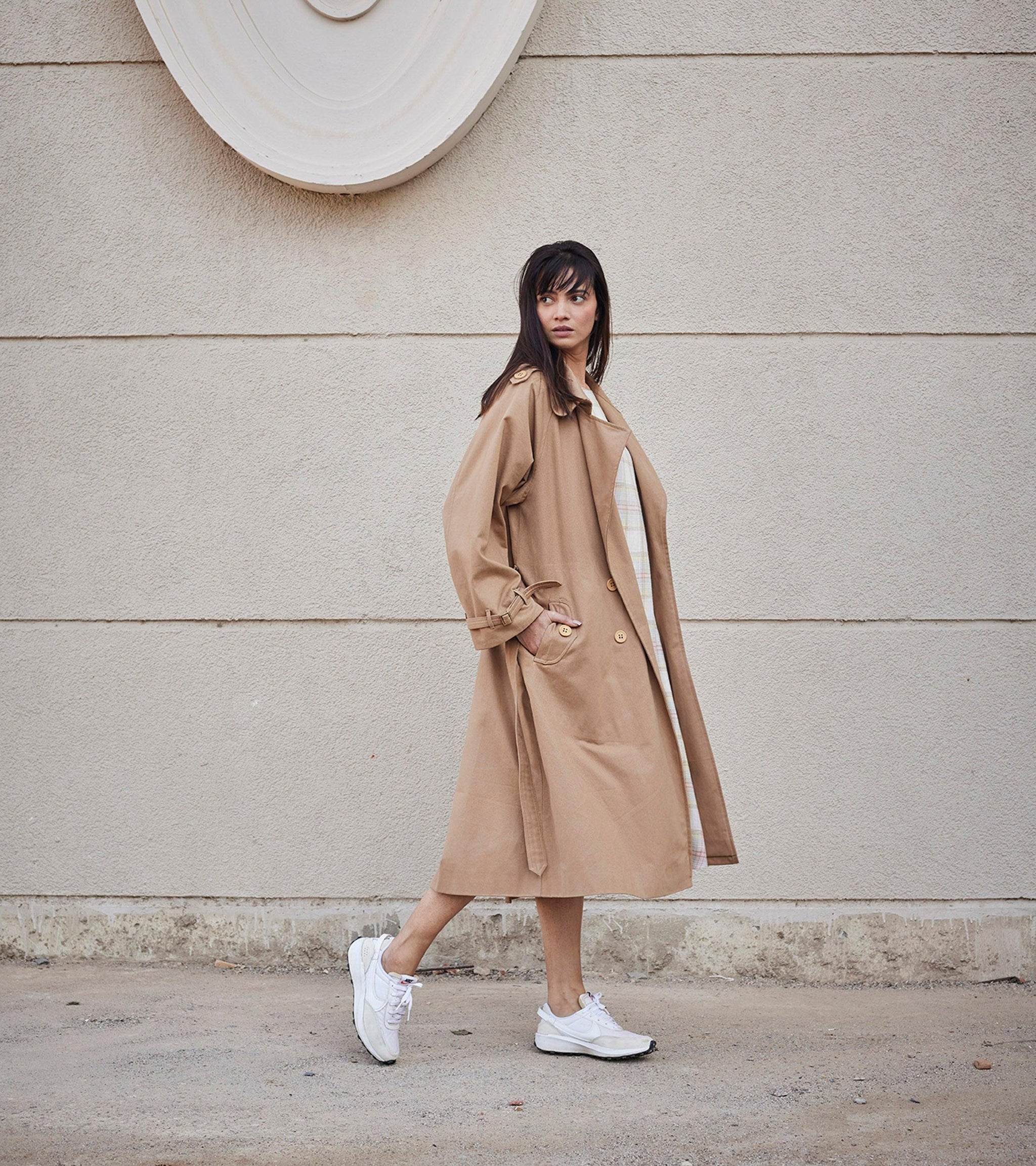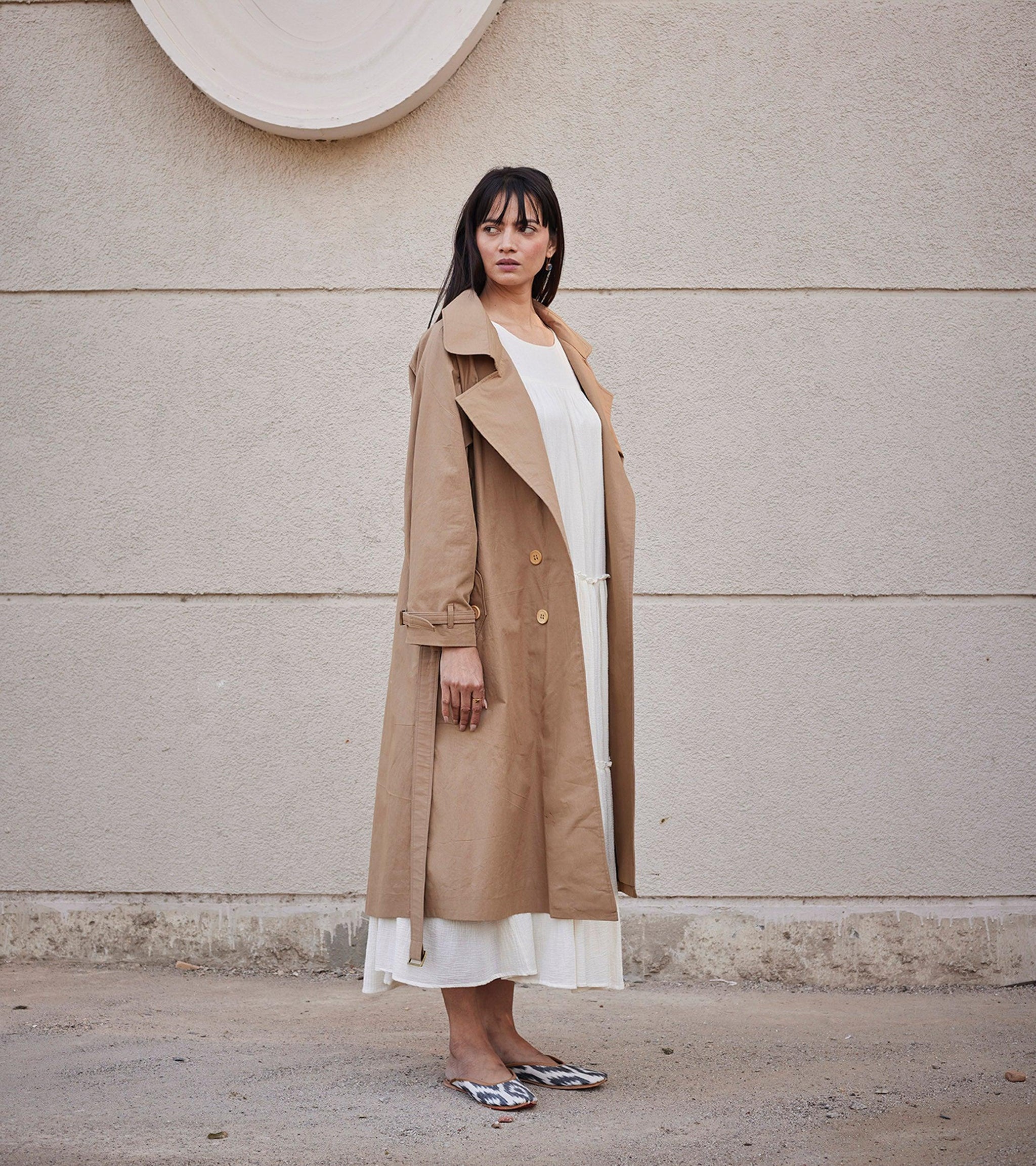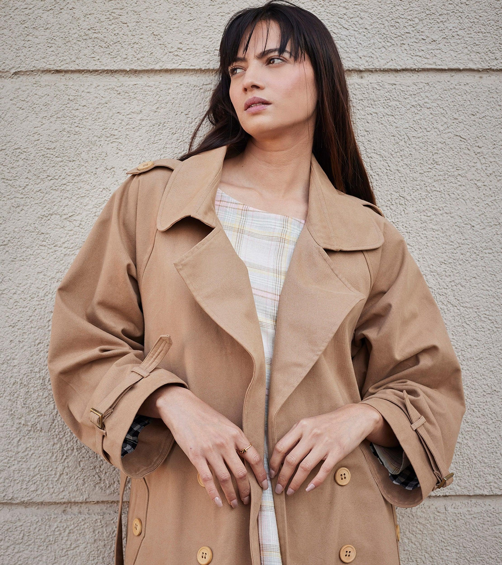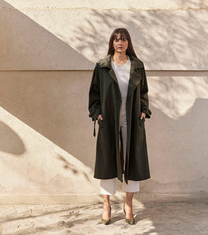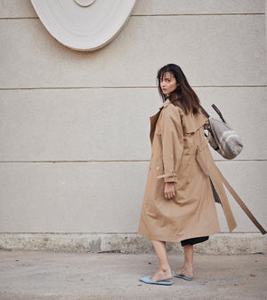 A double-breasted classic trench coat with buttoned epaulettes, bracelet cuffs and button pockets.