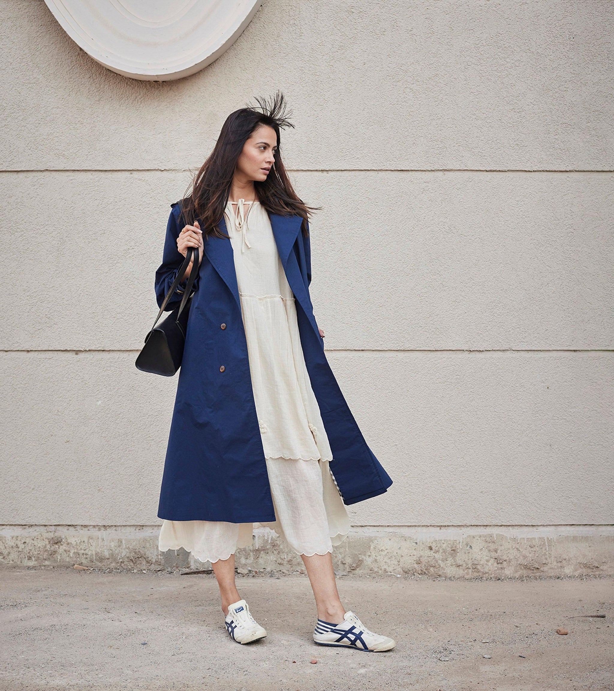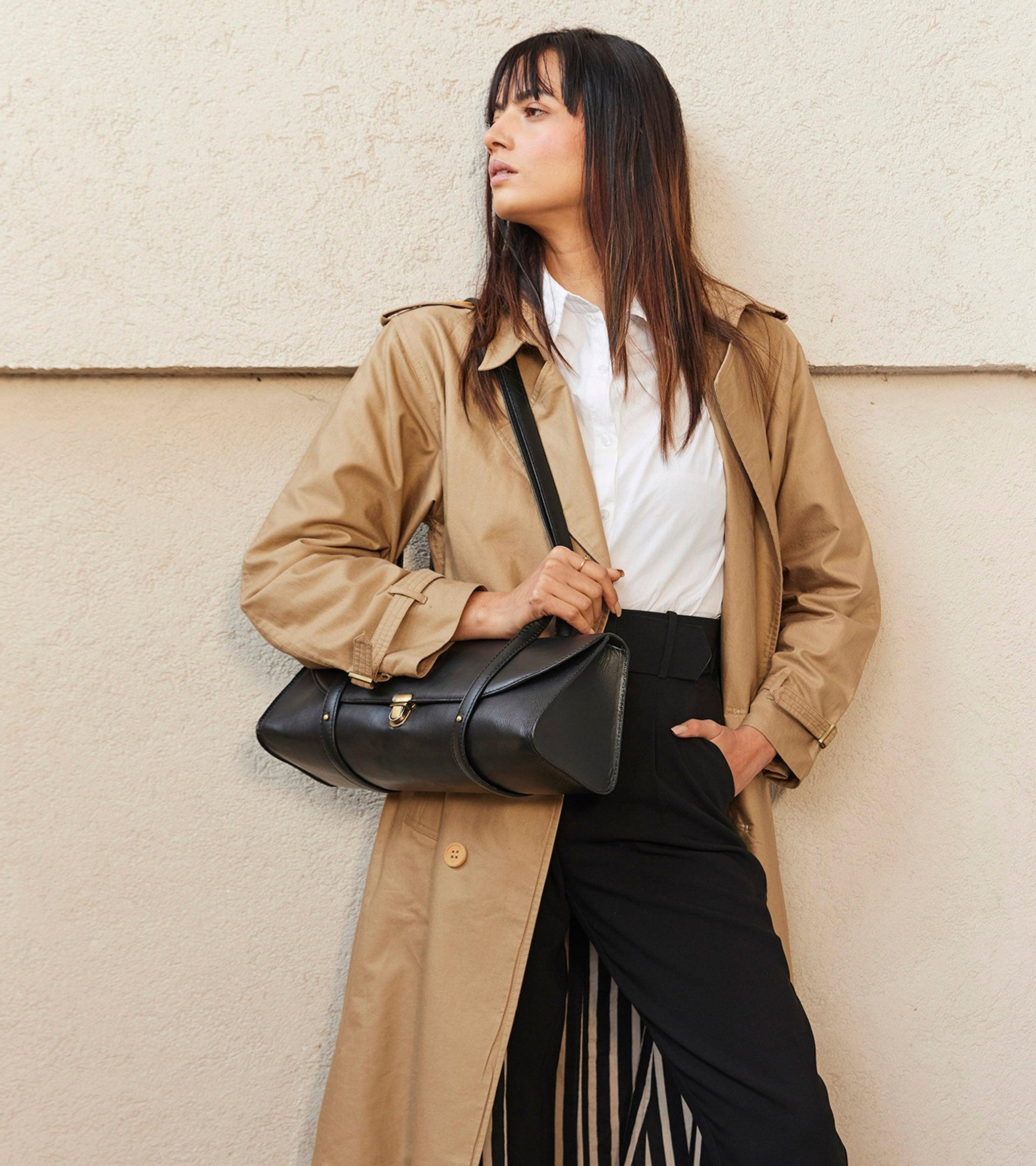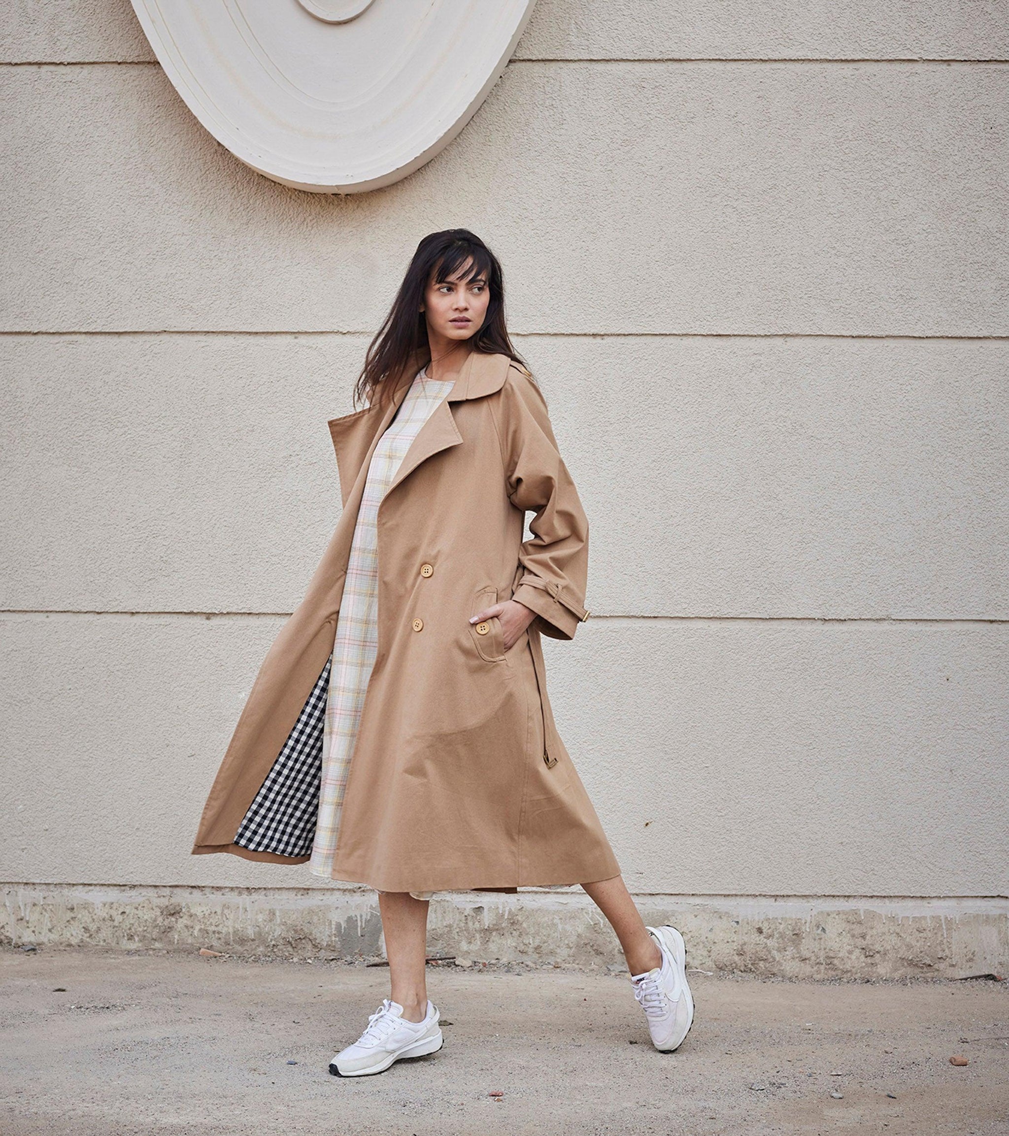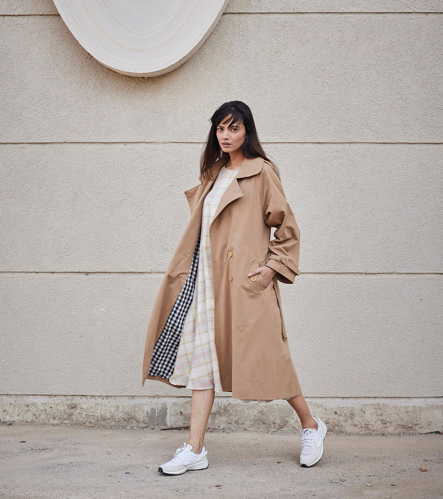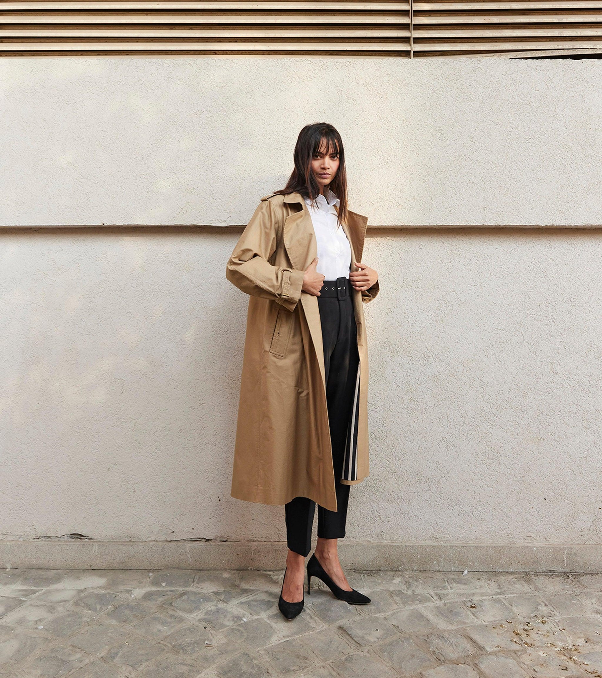 A double-breasted classic trench coat with buttoned epaulettes, bracelet cuffs and button pockets.