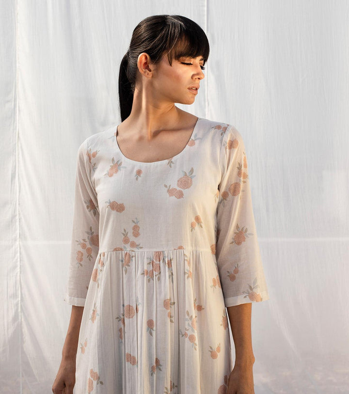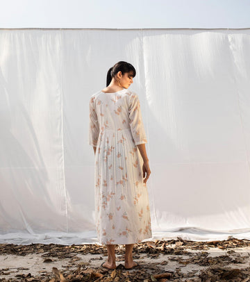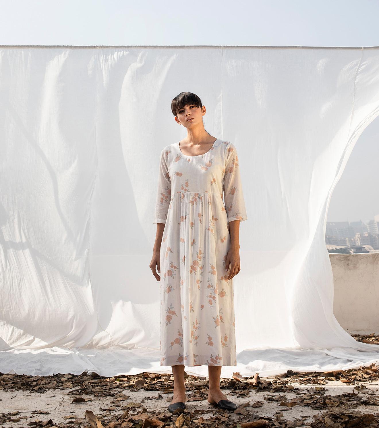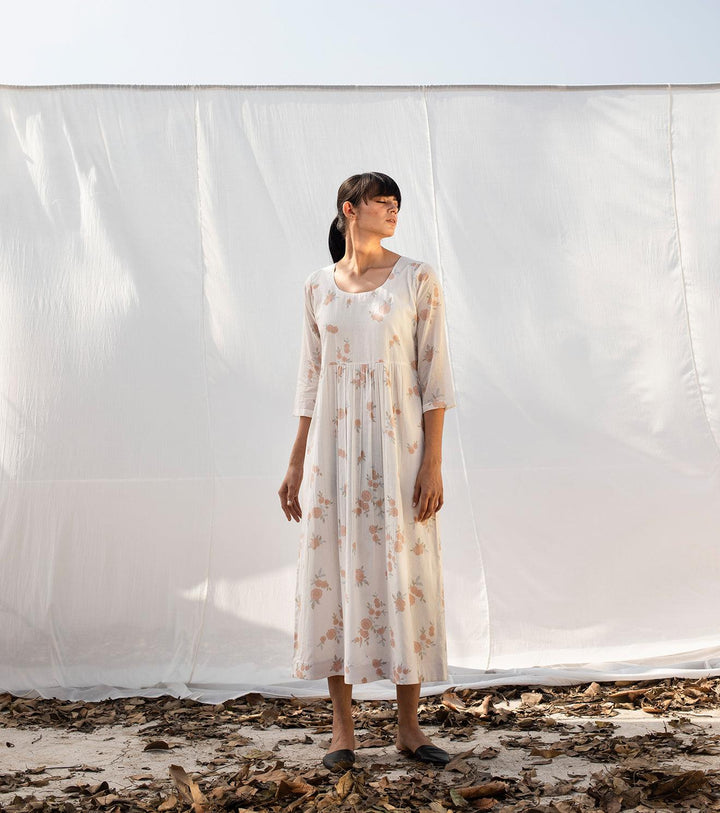 Ivory midi dress with a round neck, three-fourth sleeves and empire yoke attached to a gathered skirt. Handcrafted in mulmul with an overall delicate floral screen-printed motif.