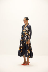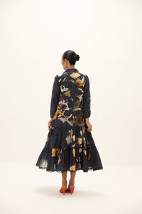 A tiered midi dress in handwoven cotton mul, featuring expressive floral prints in earthy tones of amber, ivory, and violet on a deep charcoal base. Designed with a collared neckline, gathered tiers, and delicate lace trimming at the hem, it exudes effortless femininity with a touch of drama.