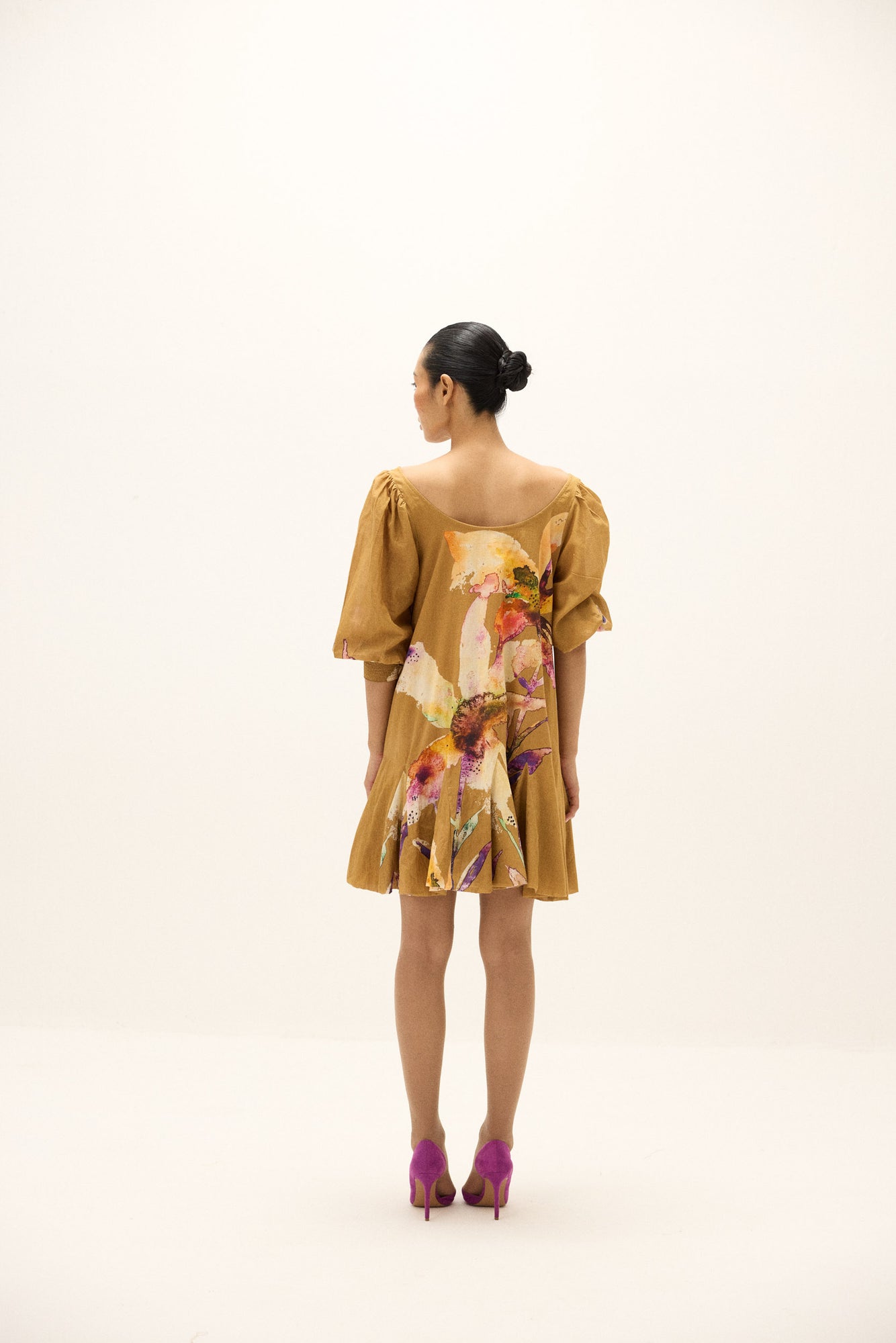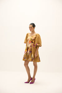 A flared mini dress in handwoven cotton mul, featuring painterly floral motifs in vivid hues of magenta, green, and ivory on a warm ochre base. Designed with a deep scooped neckline, gathered sleeves, and soft pleats for fluid movement, it’s an easy statement for relaxed elegance.