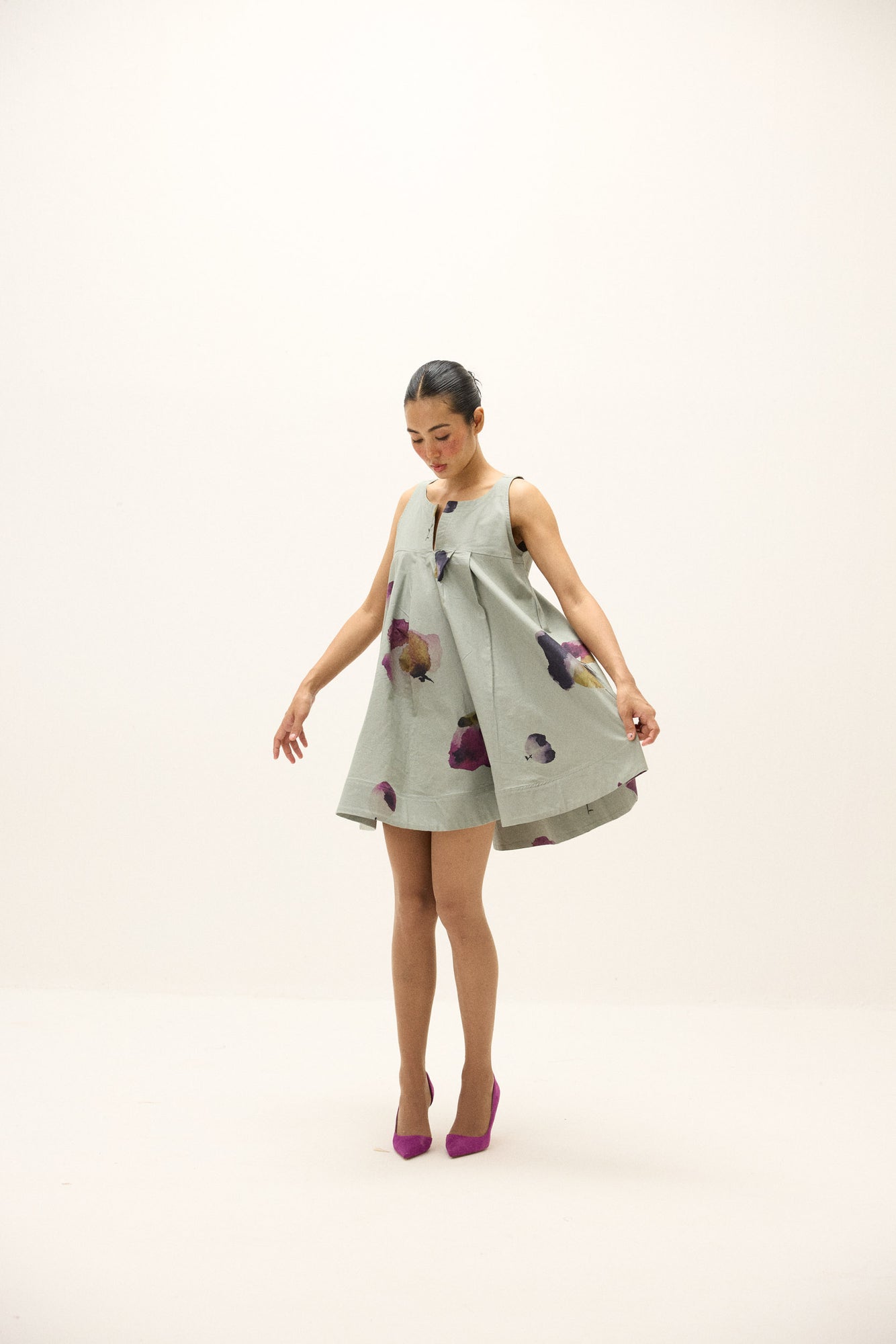 The Petal Play Dress is crafted in breathable cotton Oxford, featuring soft watercolor-style floral motifs that lend it an artistic, effortless charm. Designed with a relaxed A-line silhouette, deep inverted pleats, and side pockets, it offers ease and movement while maintaining a refined structure. Perfect for warm days or layered styling.