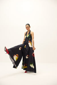 A striking halter-neck jumpsuit in cotton poplin, defined by its fluid drape and voluminous silhouette. The Petalfall Jumpsuit features an abstract floral print in vivid tones of green, rust, and ivory against a charcoal base, gathered gently at the neckline for movement and ease. A bold yet effortless piece that transitions seamlessly from day to evening.