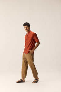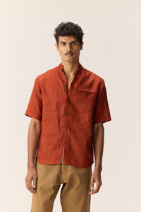 A vibrant scarlet cotton linen shirt for men featuring a mandarin collar and front button opening. The contrasting black and white check detailing near the neckline and placket adds a striking accent. Designed with one patch pocket on the front for a functional yet stylish touch.