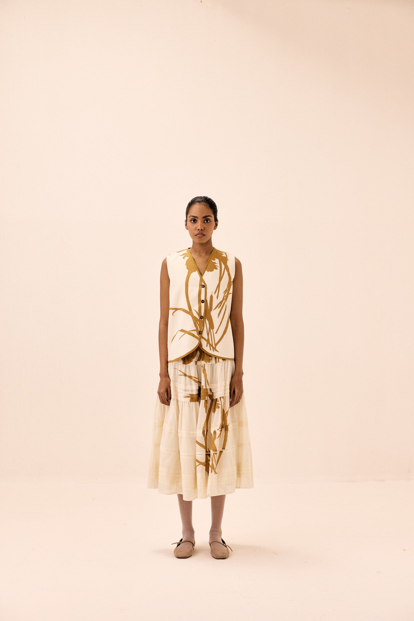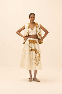 A gathered skirt in mul offering fine elegance and a graceful drape. It features a button and zipper fastening, with lace detailing.