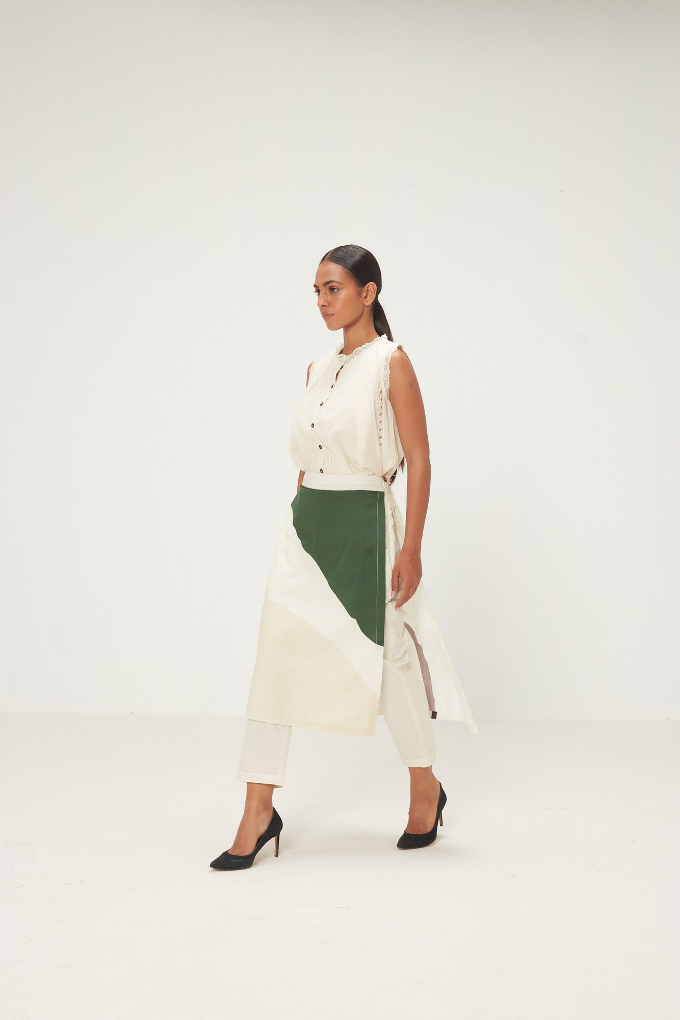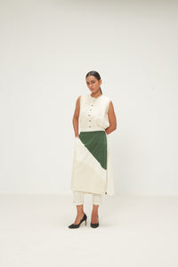 A poplin skirt trouser with structured waist and side seam pockets. The skirt is cut in a printed fabric whereas the trouser is in solid off-white poplin. Designed for ease and versatility. It has a button and zipper fastening.