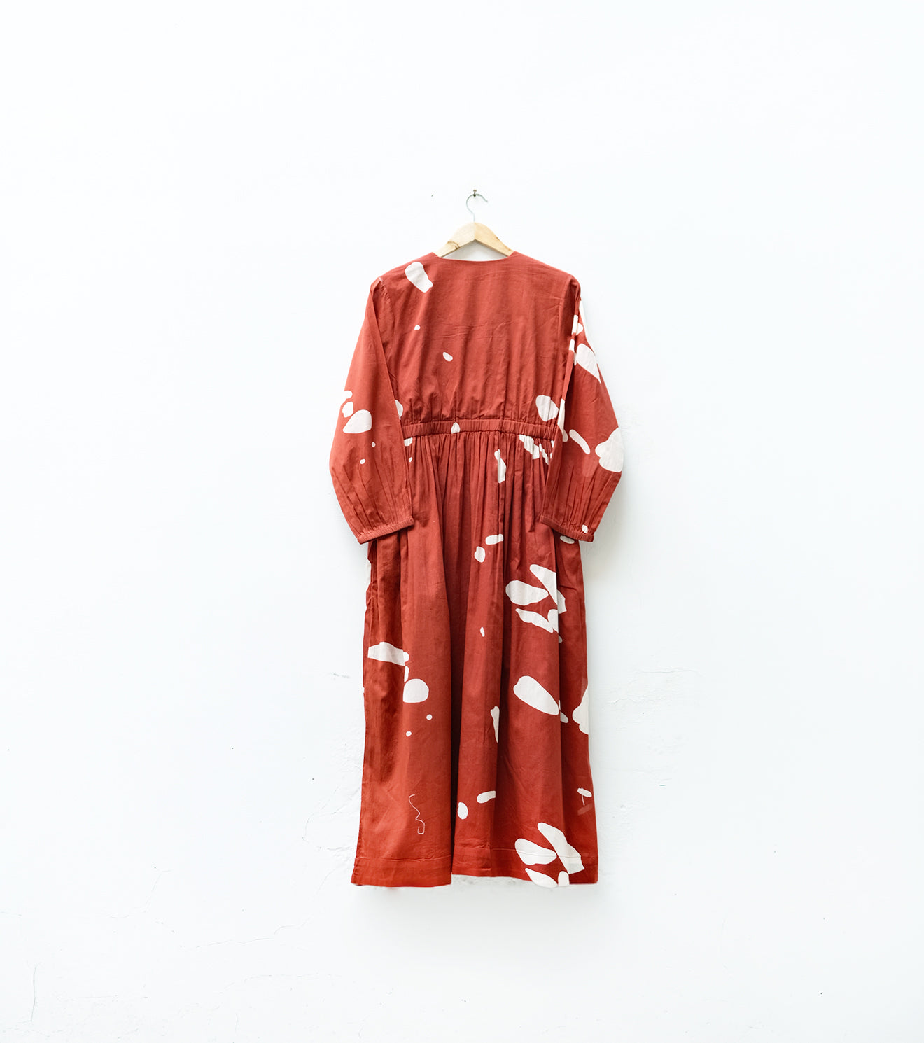 A burnt red mul dress featuring a white abstract print all over and delicate gathers at the waist. Flowing, feminine, and effortlessly elegant — perfect for days when comfort meets understated sophistication.