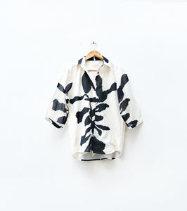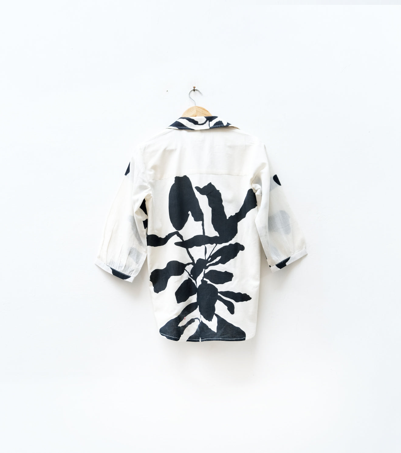 An off-white mul cotton shirt featuring a black abstract floral print all over. Light, breathable, and artistically detailed — a timeless classic that blends everyday comfort with effortless sophistication