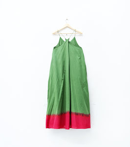A green noodle-strap maxi dress featuring a cross-back design and a soft pink dye effect at the bottom. Flowing, feminine, and effortlessly graceful — a perfect blend of playful hues and relaxed elegance.