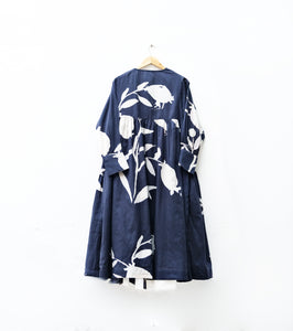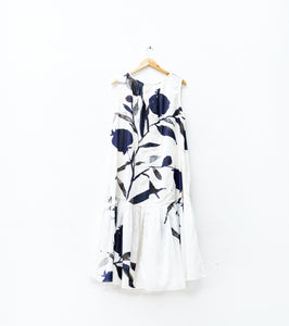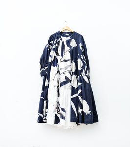 A white flared dress featuring a black abstract print all over, paired with a reversible printed cape. Artistic, versatile, and effortlessly elegant — a statement piece that transitions seamlessly from day to evening with timeless ease.