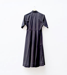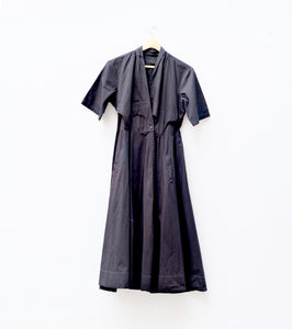 A black wrap dress crafted in soft mul with poplin detailing. Sleek, flattering, and effortlessly refined—the wrap silhouette creates a clean fit, making it a versatile essential for day or evening wear.
