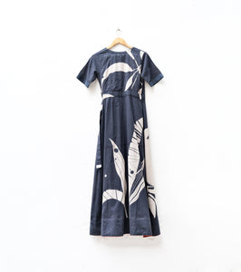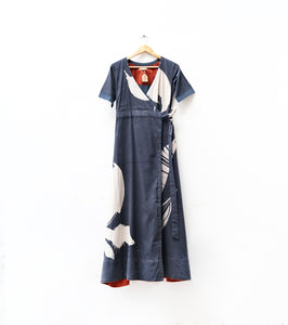 A black mul wrap dress featuring bold contrasting white floral prints—elegant, striking, and effortlessly flattering.