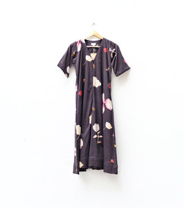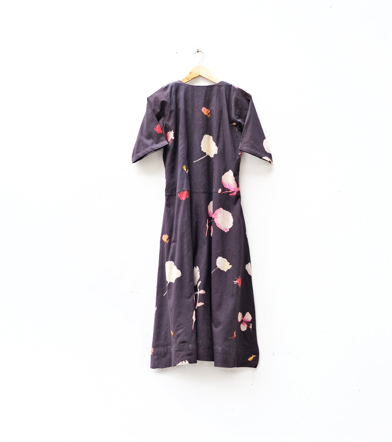 A charcoal mul jumpsuit featuring vibrant hand-painted floral motifs all over—bold, artistic, and effortlessly stylish.
