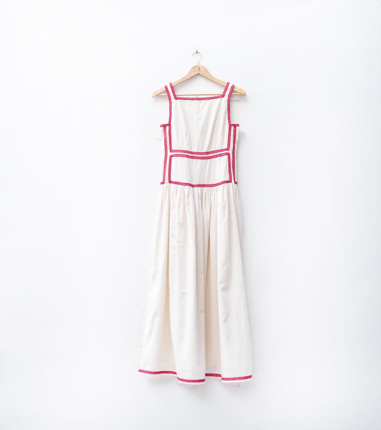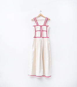 An off-white mul flared dress adorned with delicate pink lace detailing on the top, exuding soft femininity and charm. Light, graceful, and timeless — perfect for serene, sunlit days.