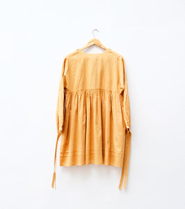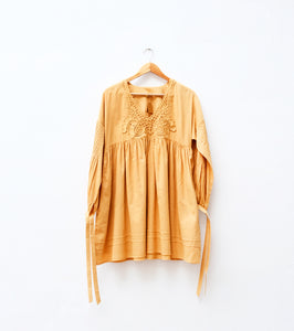A softly flowing dress in a warm marigold hue, adorned with delicate lacework along the neckline and gentle gathers through the body. Relaxed sleeves with tie details add ease, making it a quiet blend of comfort and handcrafted elegance.
