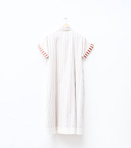An off-white mul dress featuring a clean collar and a striped lining that adds a subtle, stylish contrast. Lightweight, airy, and effortlessly refined—perfect for everyday elegance with a hint of playful detail.