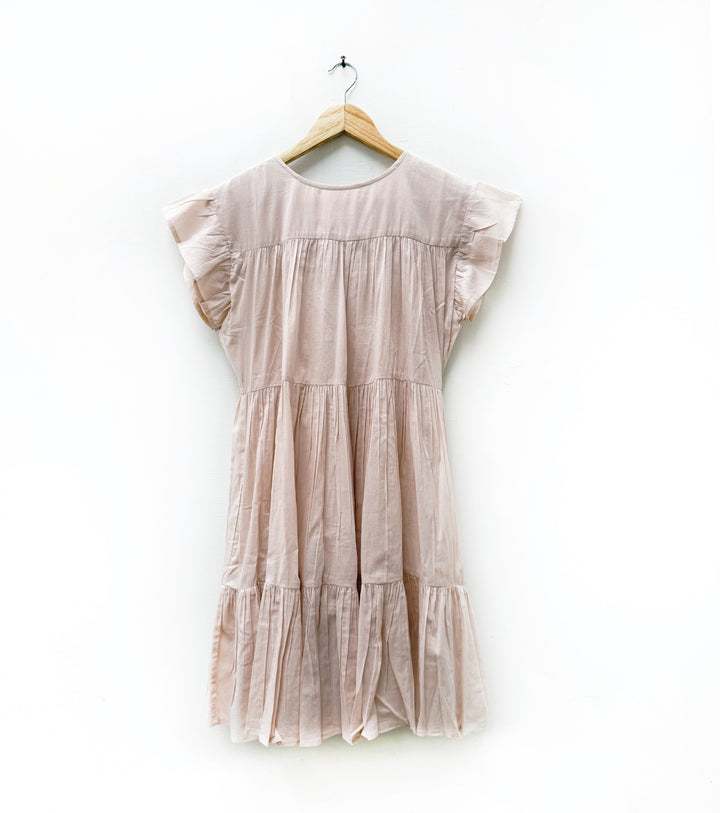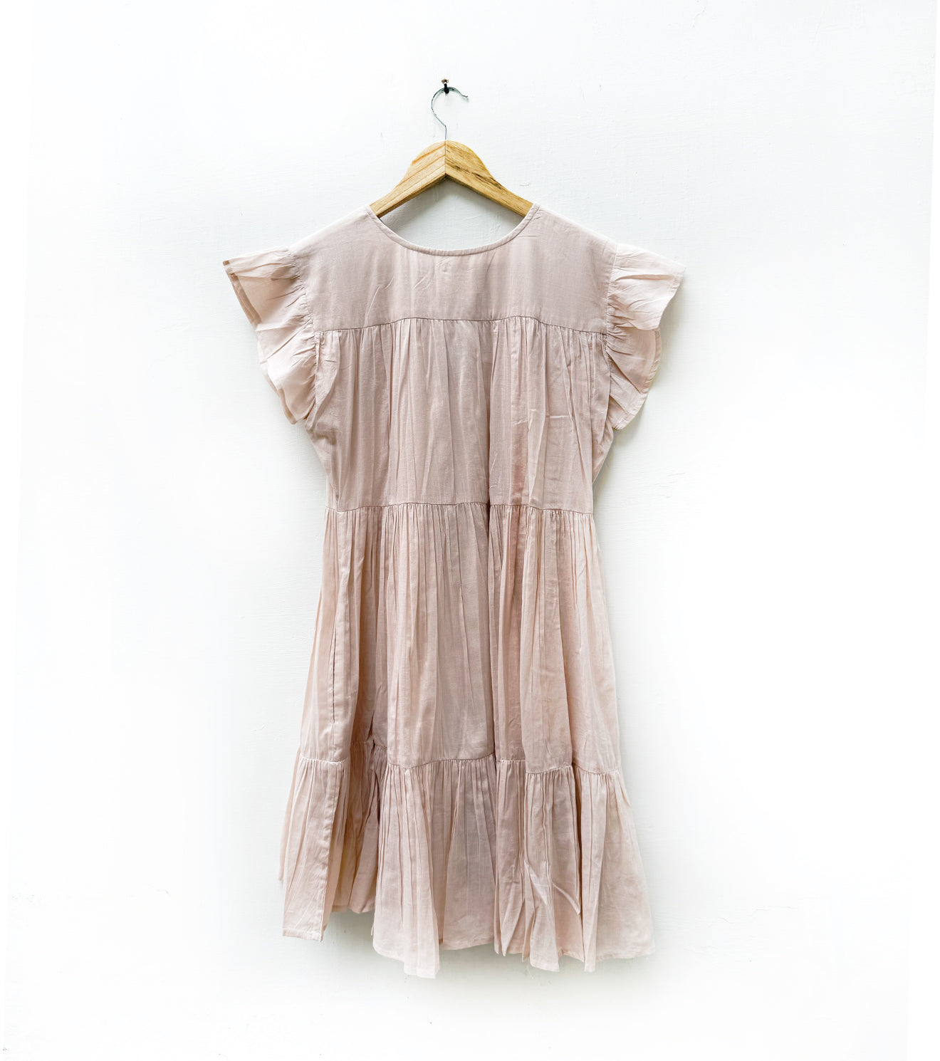 A pink dress crafted in cotton mul with gather detailing on sleeves.