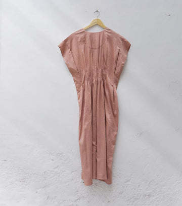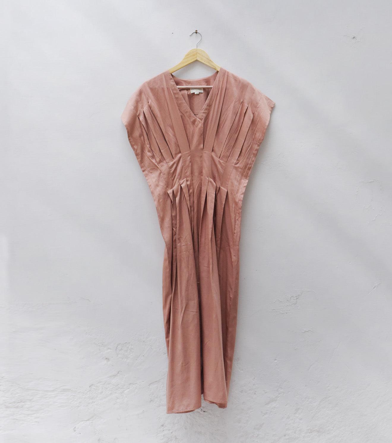 A pink poplin dress with pleated neckline and back waist elastic for a good fit . Please refer to the measurements below for sizing. These are garment measurements in inches.