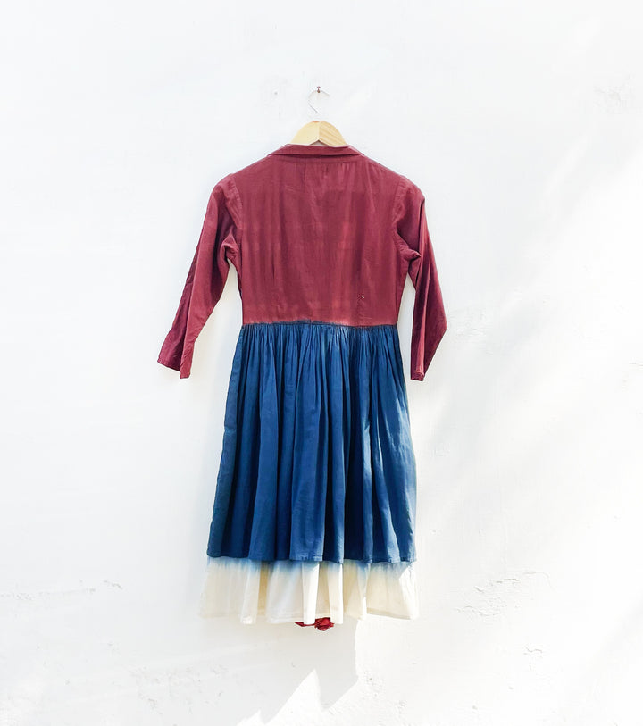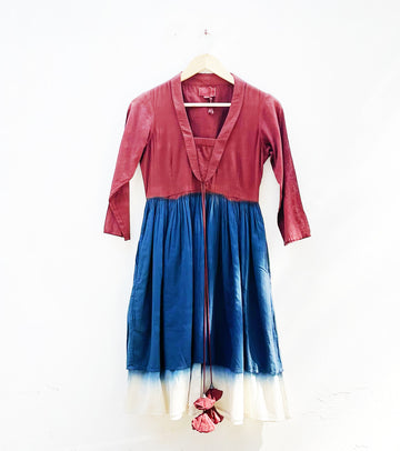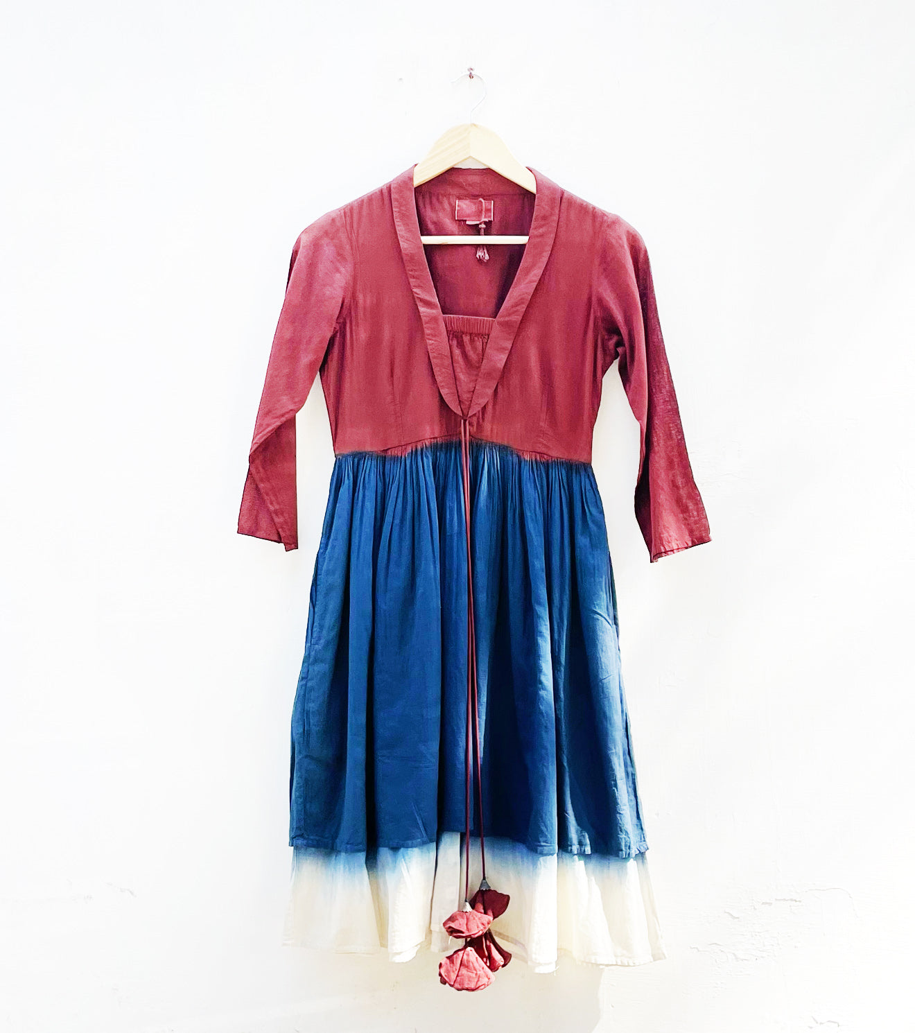 A red and blue short dress made in cotton mul with a V neck and drawstring detailing in the front.