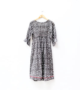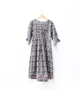 A lightweight printed mul dress featuring a finely smocked bodice for a comfortable, secure fit. Soft, breathable, and effortlessly flowy—perfect for everyday ease and warm-weather wear.