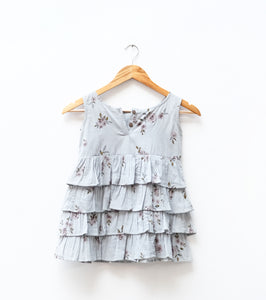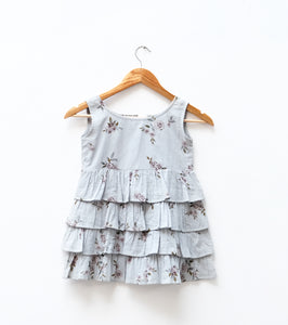 A softly tiered dress in a gentle powder-blue base, scattered with delicate floral motifs. Designed with layered gathers and a clean neckline, it moves lightly with every step, capturing an easy, garden-fresh charm.