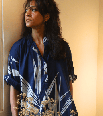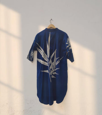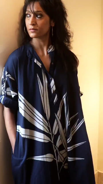 A deep blue shirt dress, crafted from soft and breathable cotton mul fabric. adorned with a statement print, it exudes timeless charm. featuring front button opening for effortless wear.