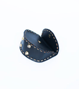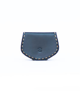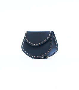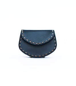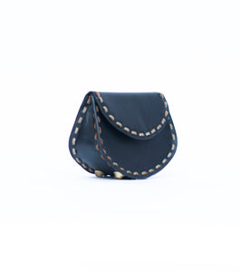 A structured black leather mini clutch with fine edge detailing and a sleek tich-button closure. Compact yet commanding, it carries quiet confidence — crafted for evenings that call for understated grace.
