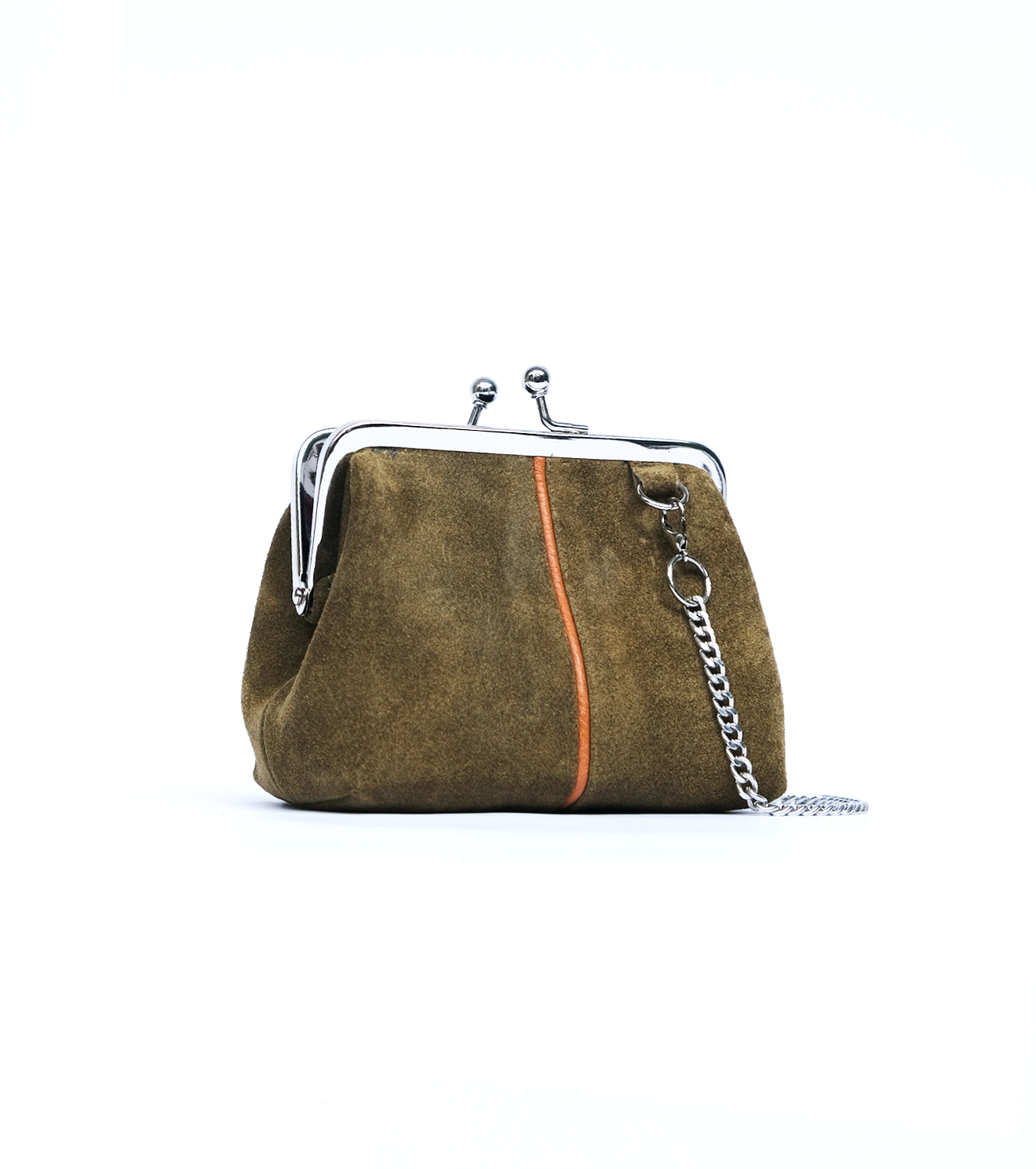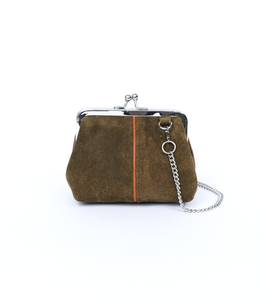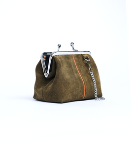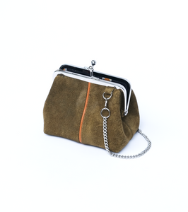 An Olive green blue suede clutch with a pee-ka-boo leather detailing. It comes with a metal strap.