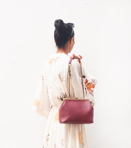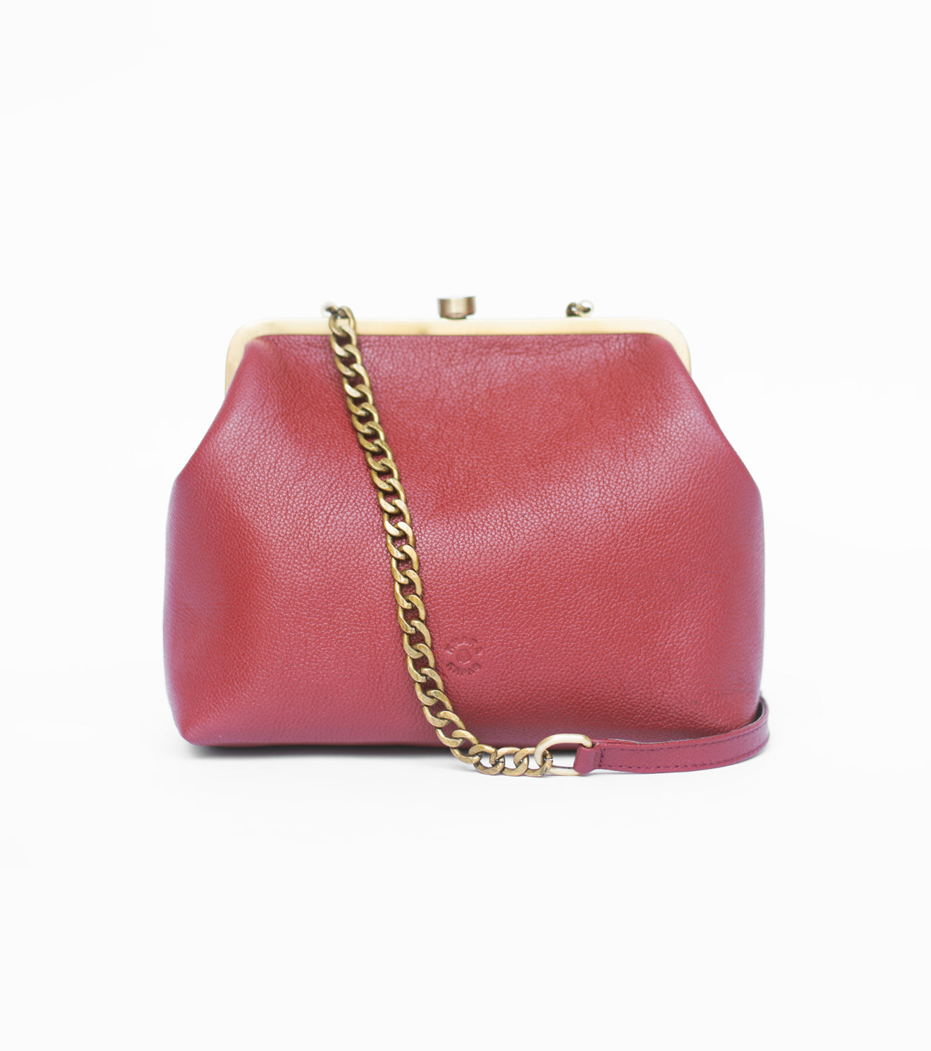 Crafted in rich burgundy textured leather ,this structured clutch features a sleek metal frame that sharpens its clean, sculpted form. While the leather straps are refined yet contemporary, designed to elevate the look.