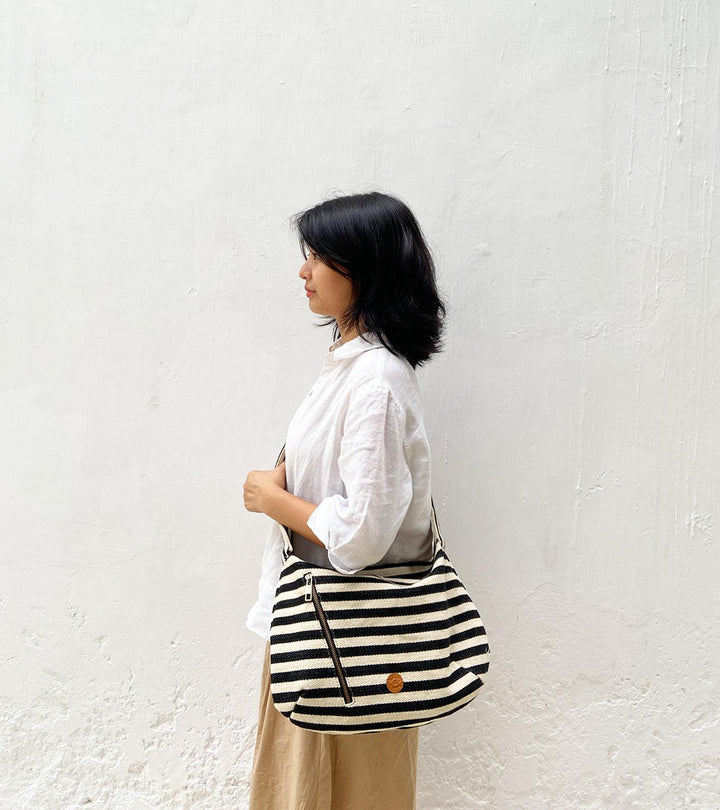 A spacious bag handcrafted in handloom cotton. It comes with one zipper pocket inside. A perfect bag to carry your essentials and standout at the same time.