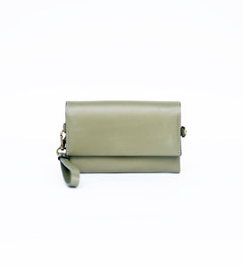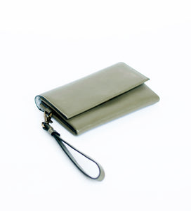 A compact sage-green wallet crafted in genuine leather, detailed with a sleek tich button closure and a side holding strap for ease. Minimal, sturdy, and timeless — made to age beautifully with every use.