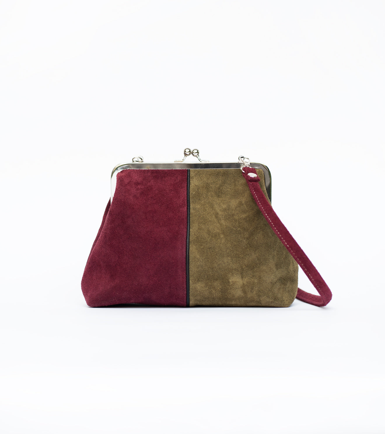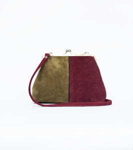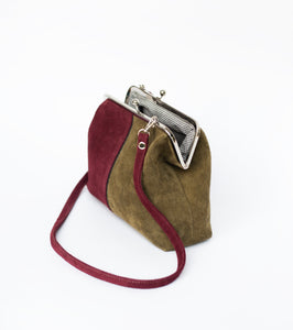 This structured suede bag showcases a striking contrast of earthy khaki green and deep burgundy, elegantly outlined with black leather piping. The refined metal frame enhances its silhouette, while the unique suede straps add subtle textural interest.