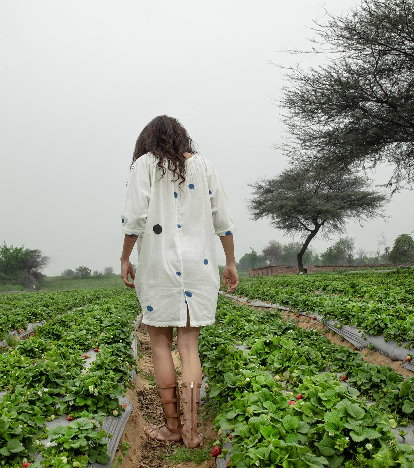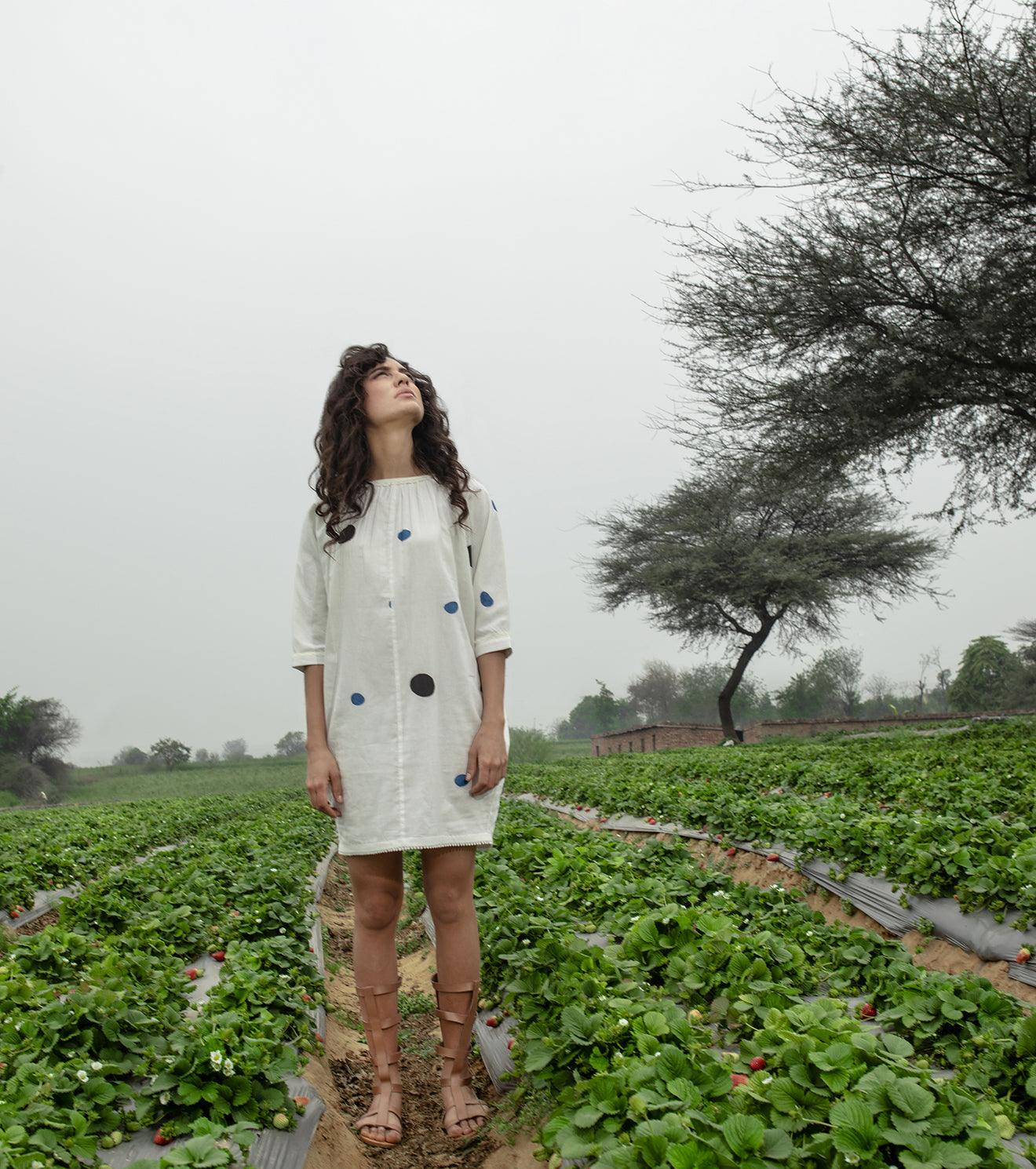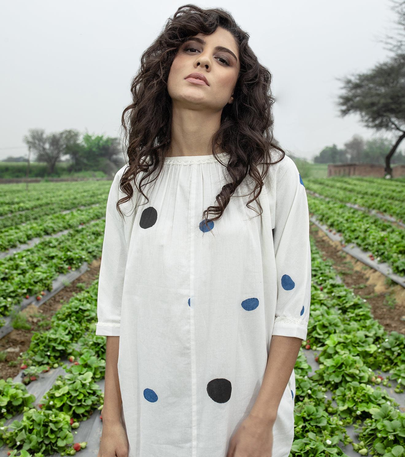 Mulmul tunic knee length dress, with short sleeves, boat neckline with lace detailing, inseam pockets, and block printed polka all over.