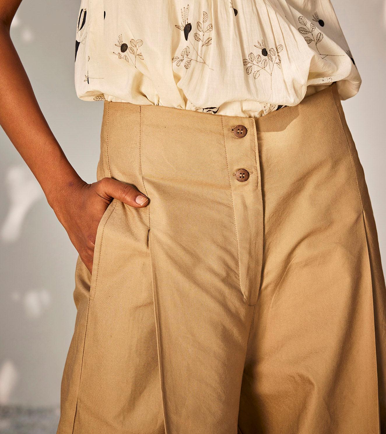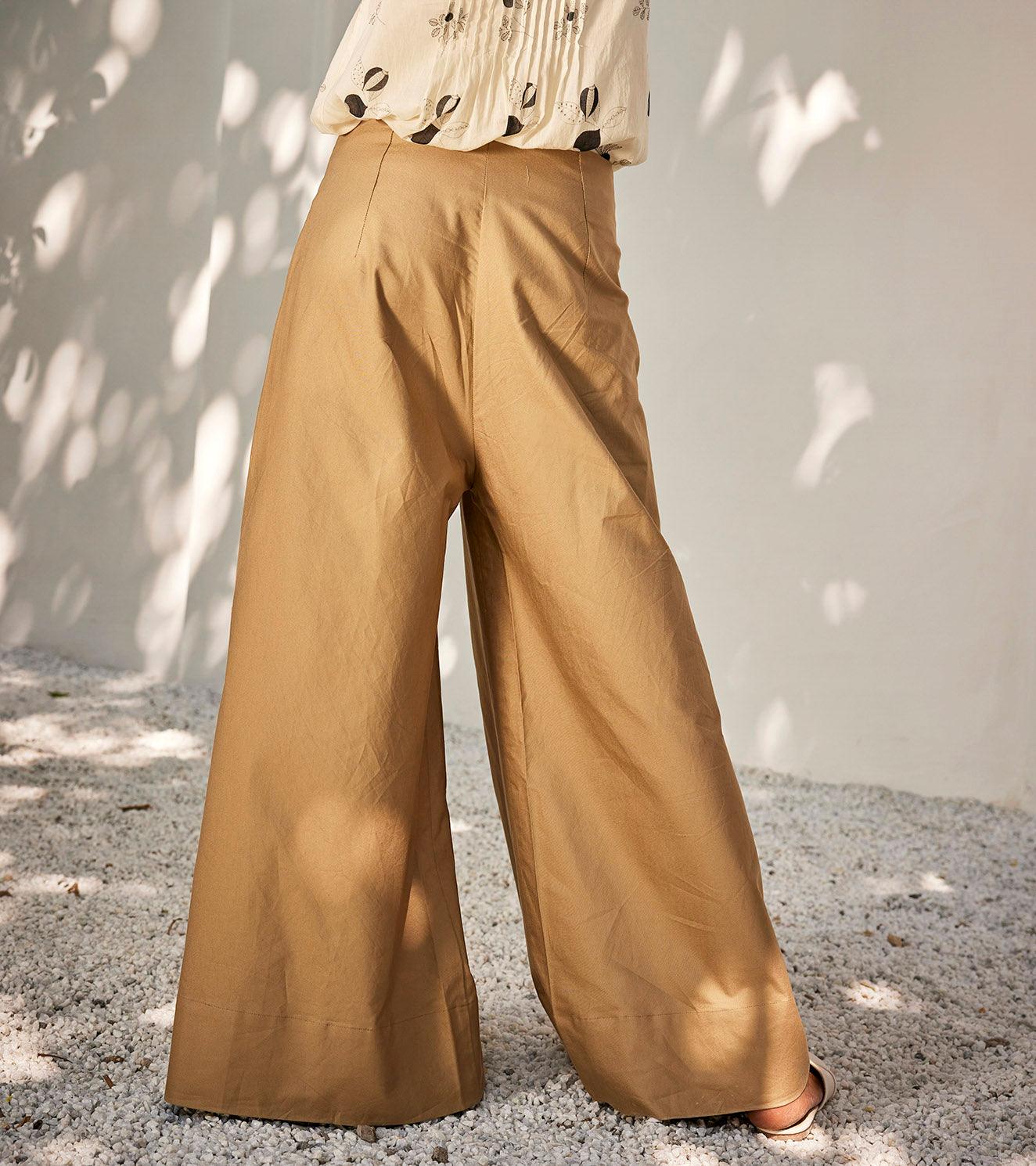 A khaki twill cotton flared pleated trouser with side seam pockets and front button opening.