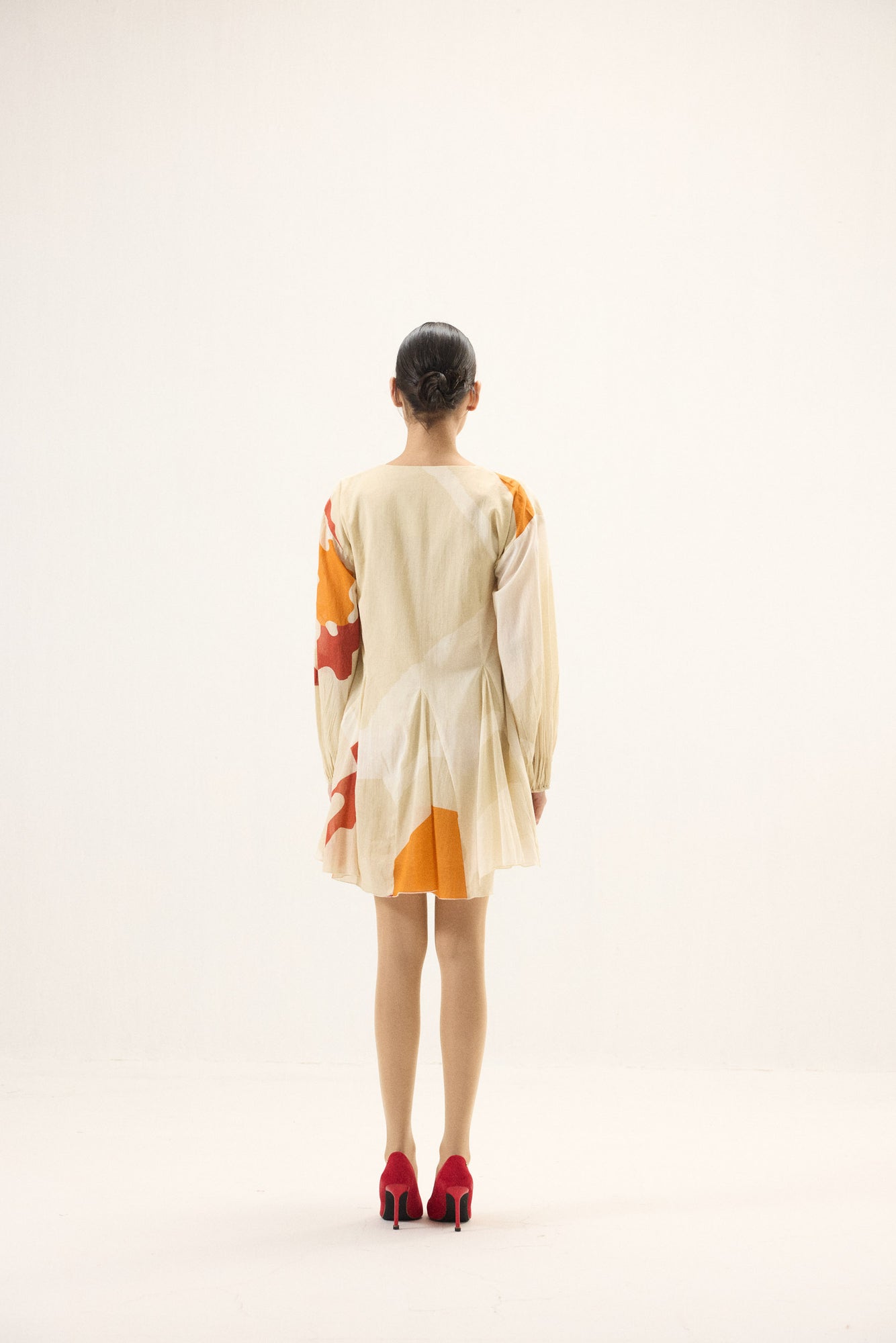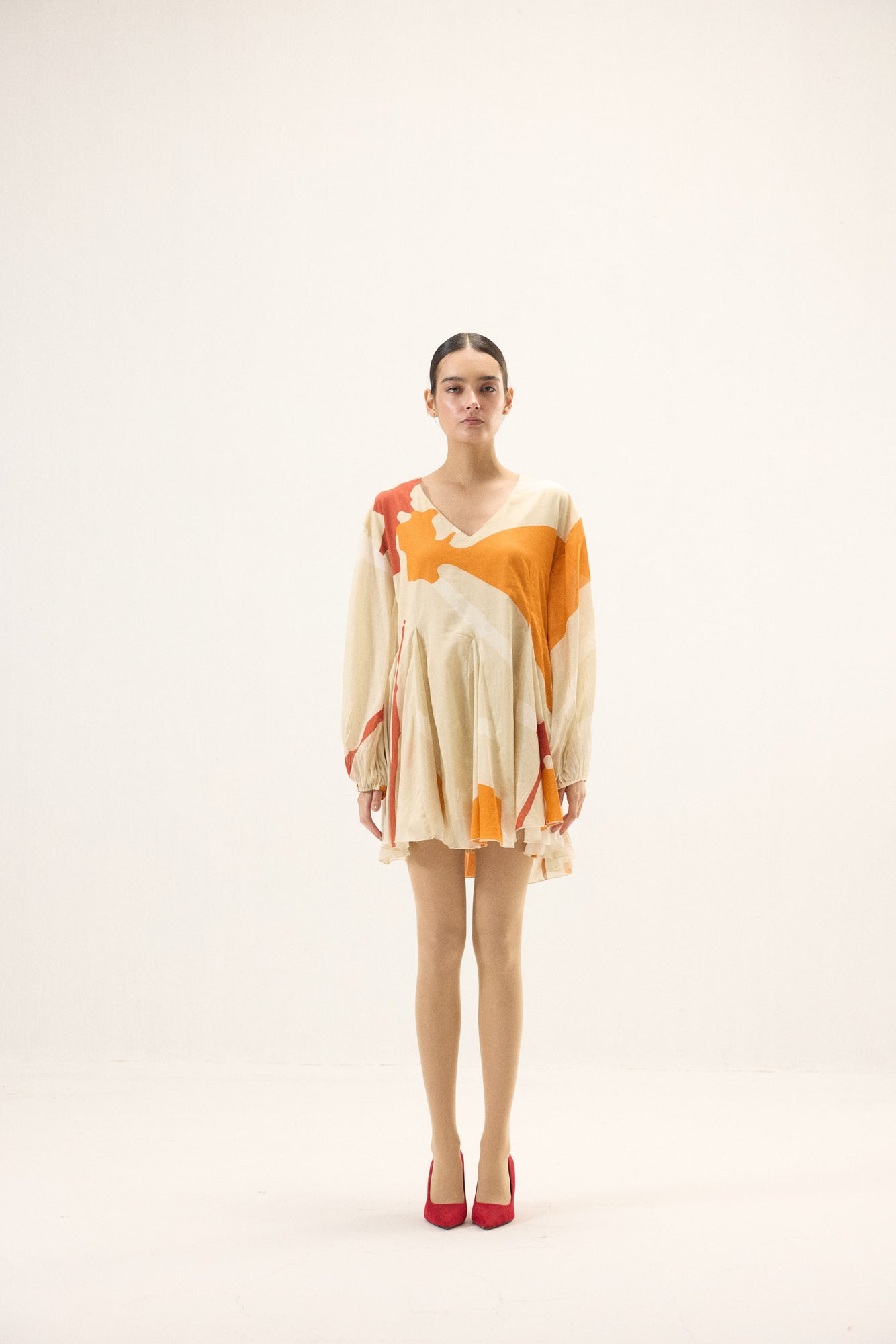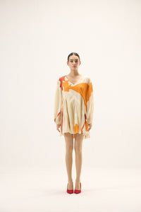 Crafted in airy cotton mul, this dress in warm ivory and bright colors, moves with an effortless grace. Designed with a soft V neckline and full-length puff sleeves finished with gentle elasticated cuffs, it balances volume with ease. Godet panels at the hem create fluid flares that sway beautifully with every step, lending the silhouette a light, flowing charm, perfect for days that call for quiet elegance and comfort.