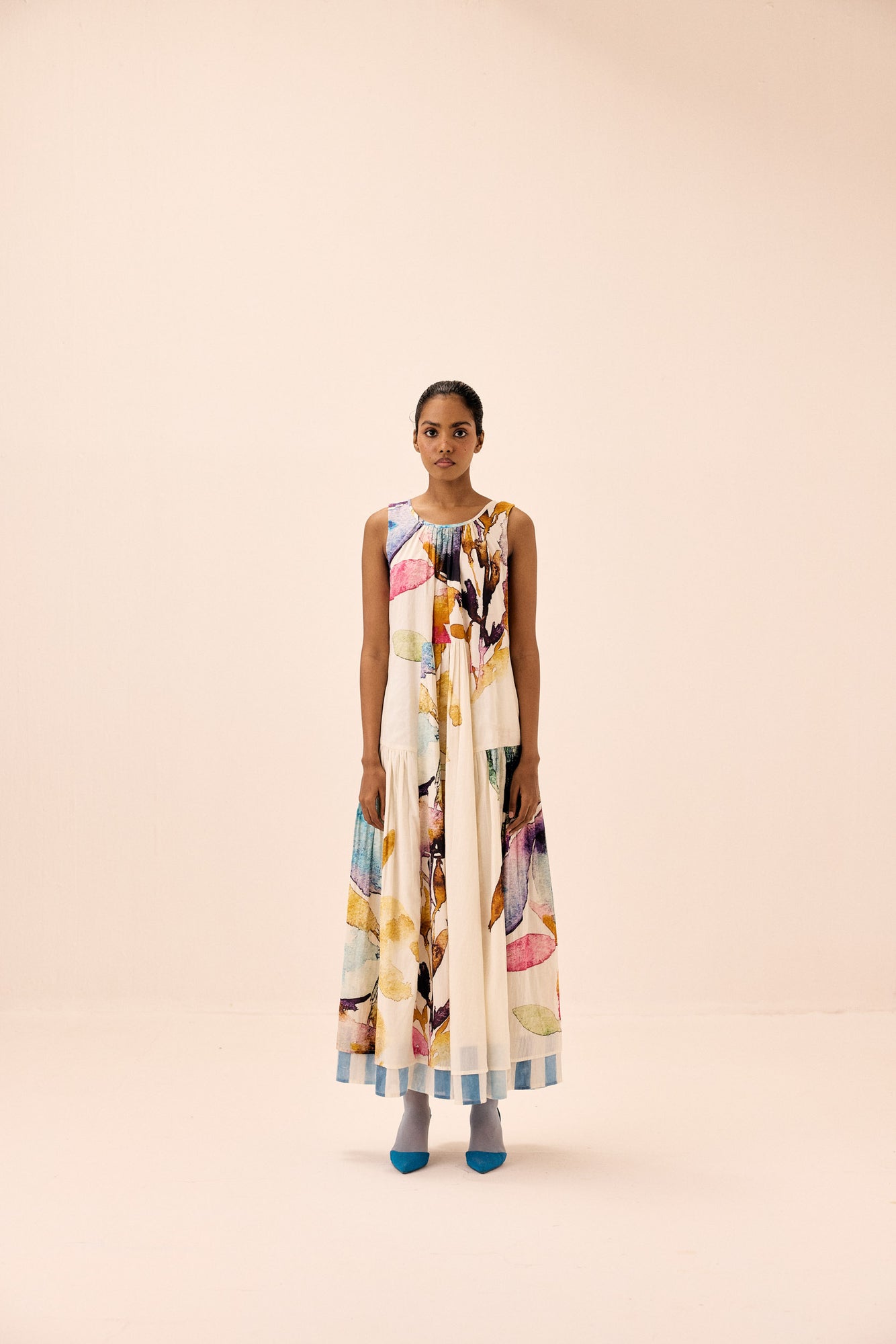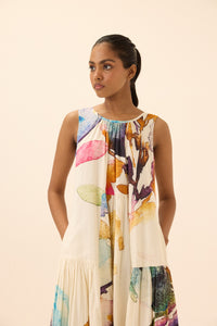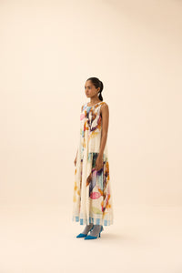 This dress, crafted from light and breathable mul fabric, showcases a vibrant floral print with bursts of color with lace details. The relaxed, tiered design combines artistic flair with an elegant, flowing silhouette. Fully lined for a smooth, comfortable finish.