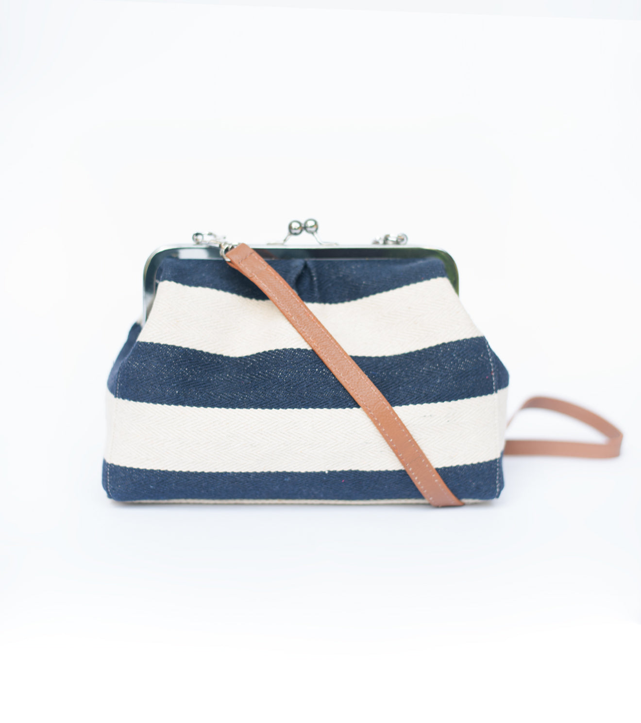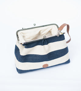A timeless piece crafted from sturdy canvas, this navy and ivory striped clutch brings effortless charm to your everyday style. Its clean, minimal aesthetic makes it a versatile accessory for brunch outings, travel, or casual evenings. The classic metal frame adds structure and sophistication, while the canvas body keeps it light and durable.