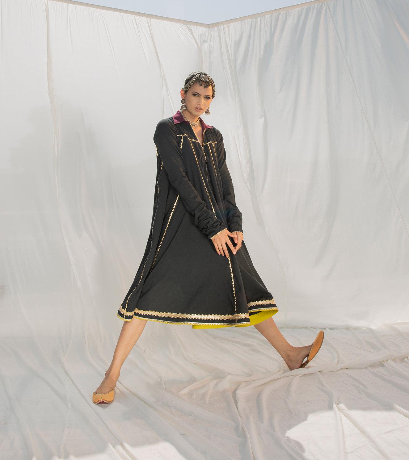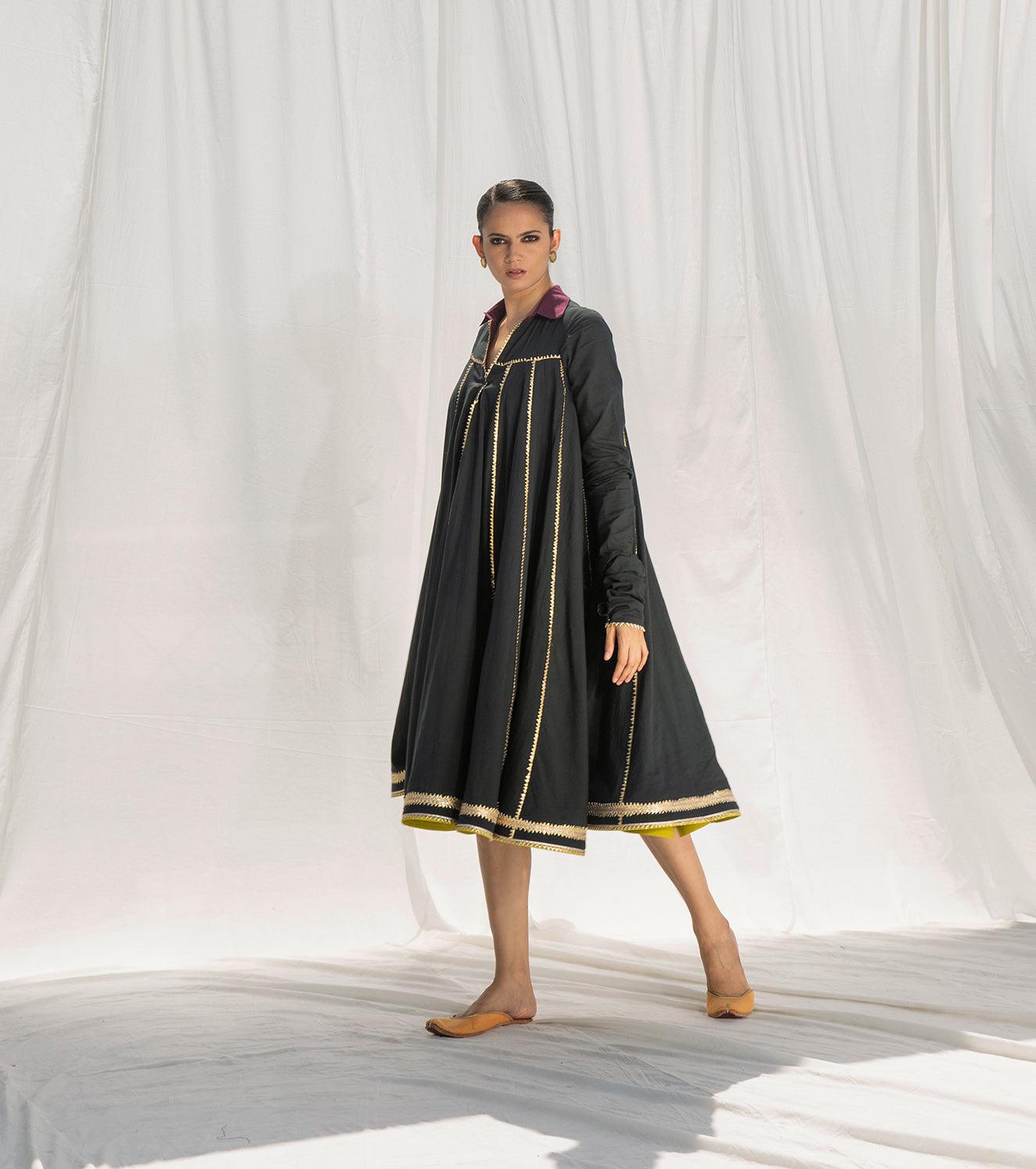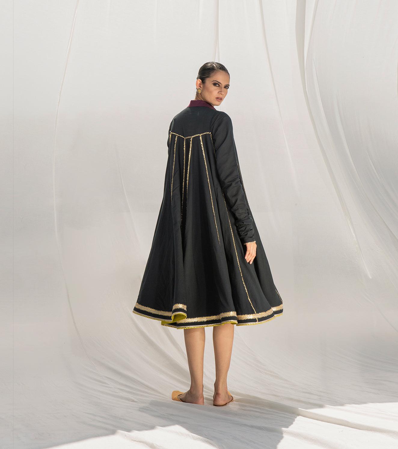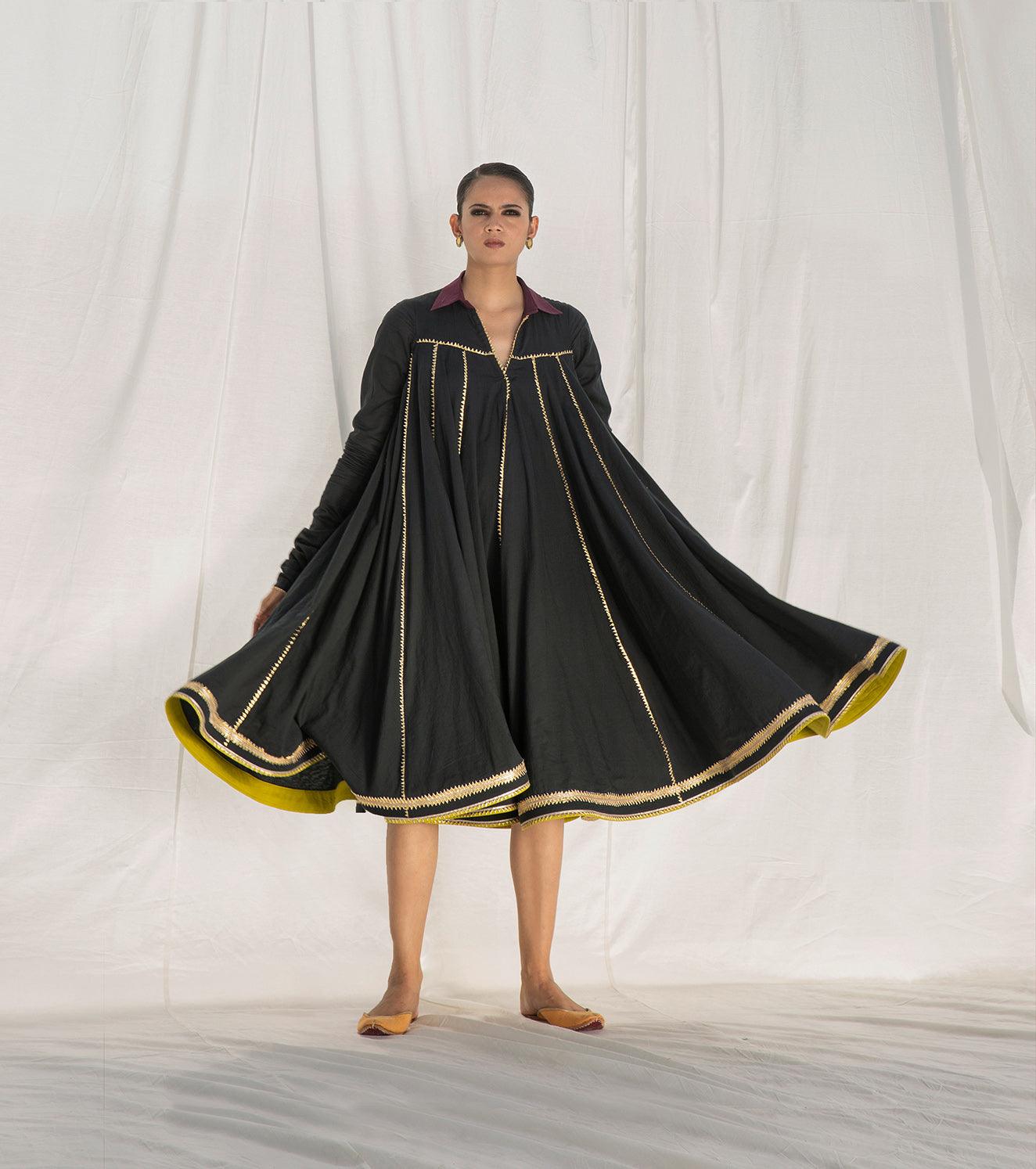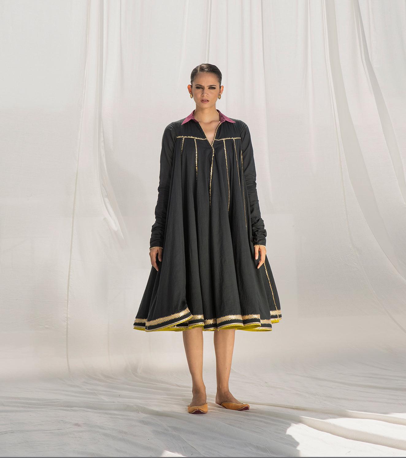 This breathtaking dual layered mulmul dress is crafted in 100% cotton fabric. Multiple panels are finely finished with intricate gota work to give it a beautiful flare. It's a perfect blend of traditional details with a modern twist. The design features a classic collar, churidar sleeves and contrasting hemline with heavy gota work.