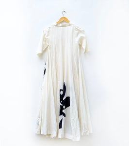A voluminous off white dress, crafted from breathable soft cotton mul fabric. adorned with a statement print.