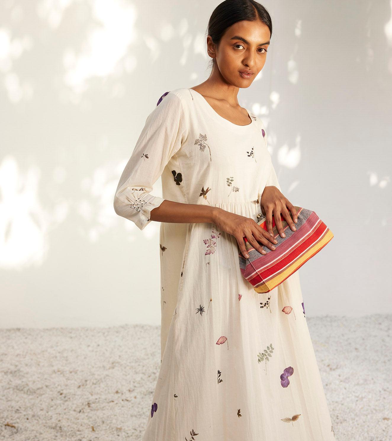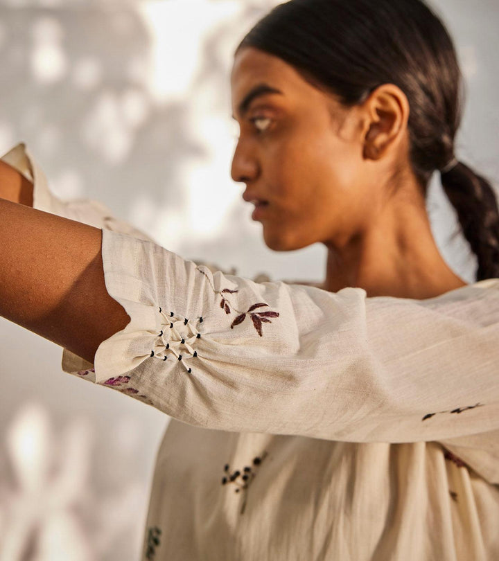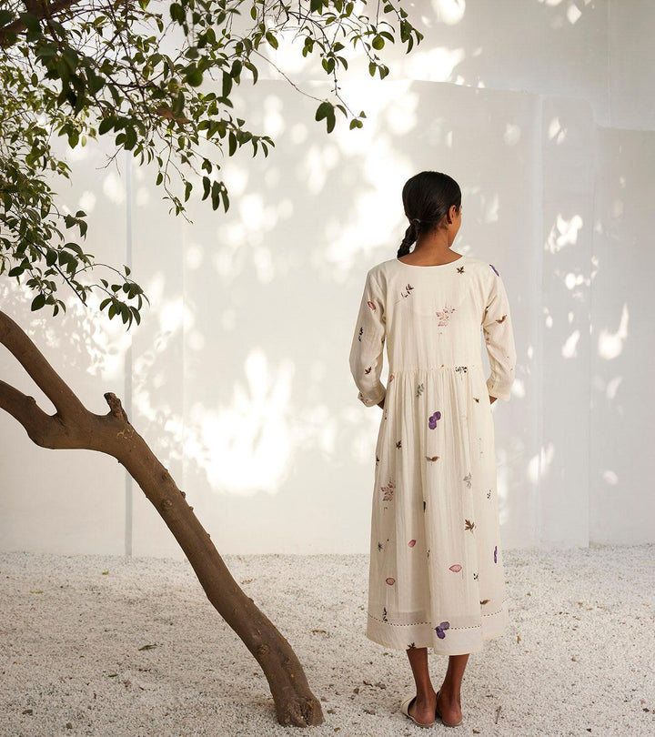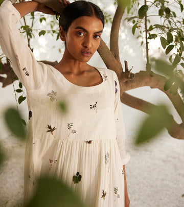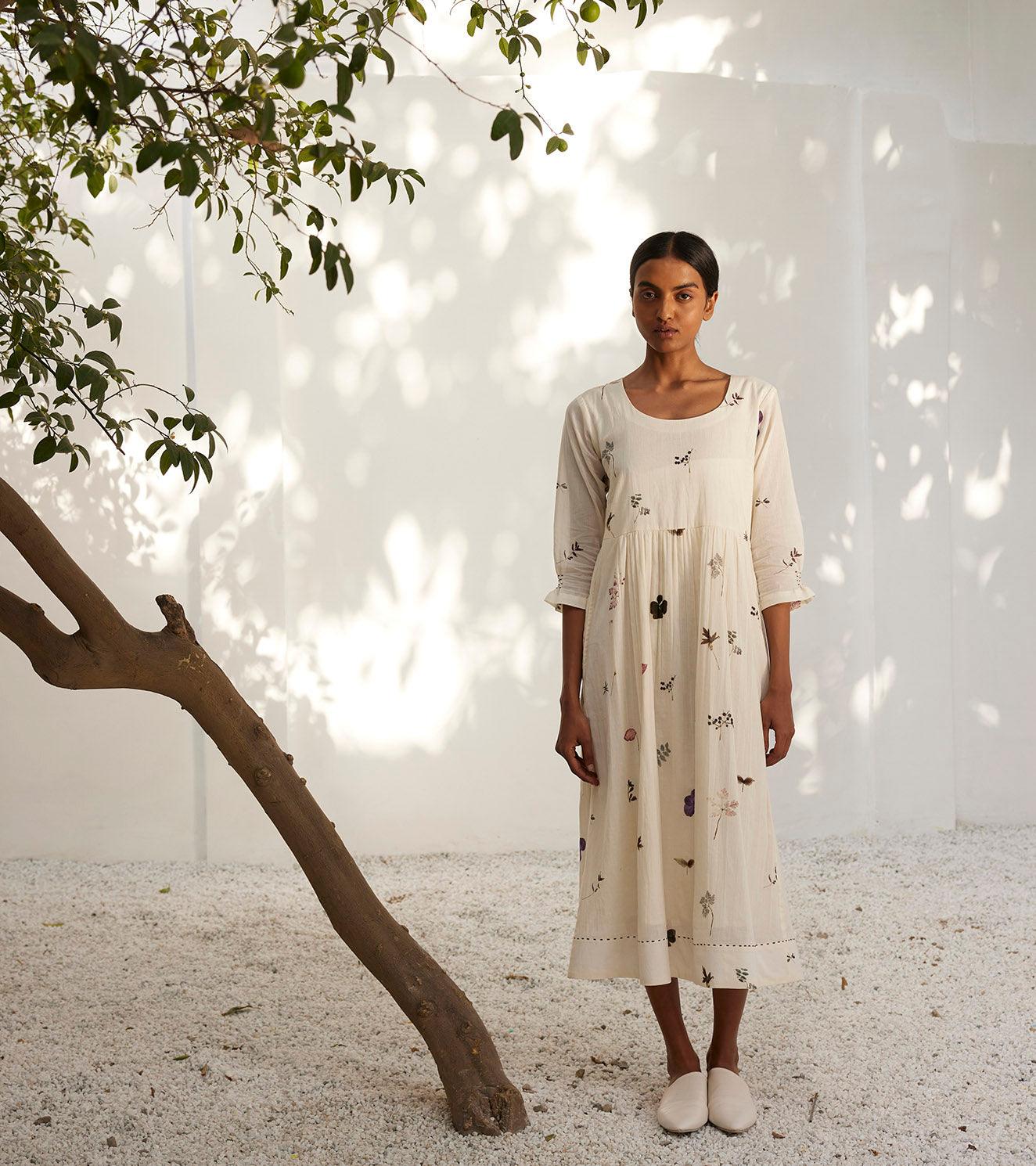 An off-white mulmul cotton dress with gathers at the waistline, smocking around the sleeve hem and hand embroidered running stitches along the dress hemline.