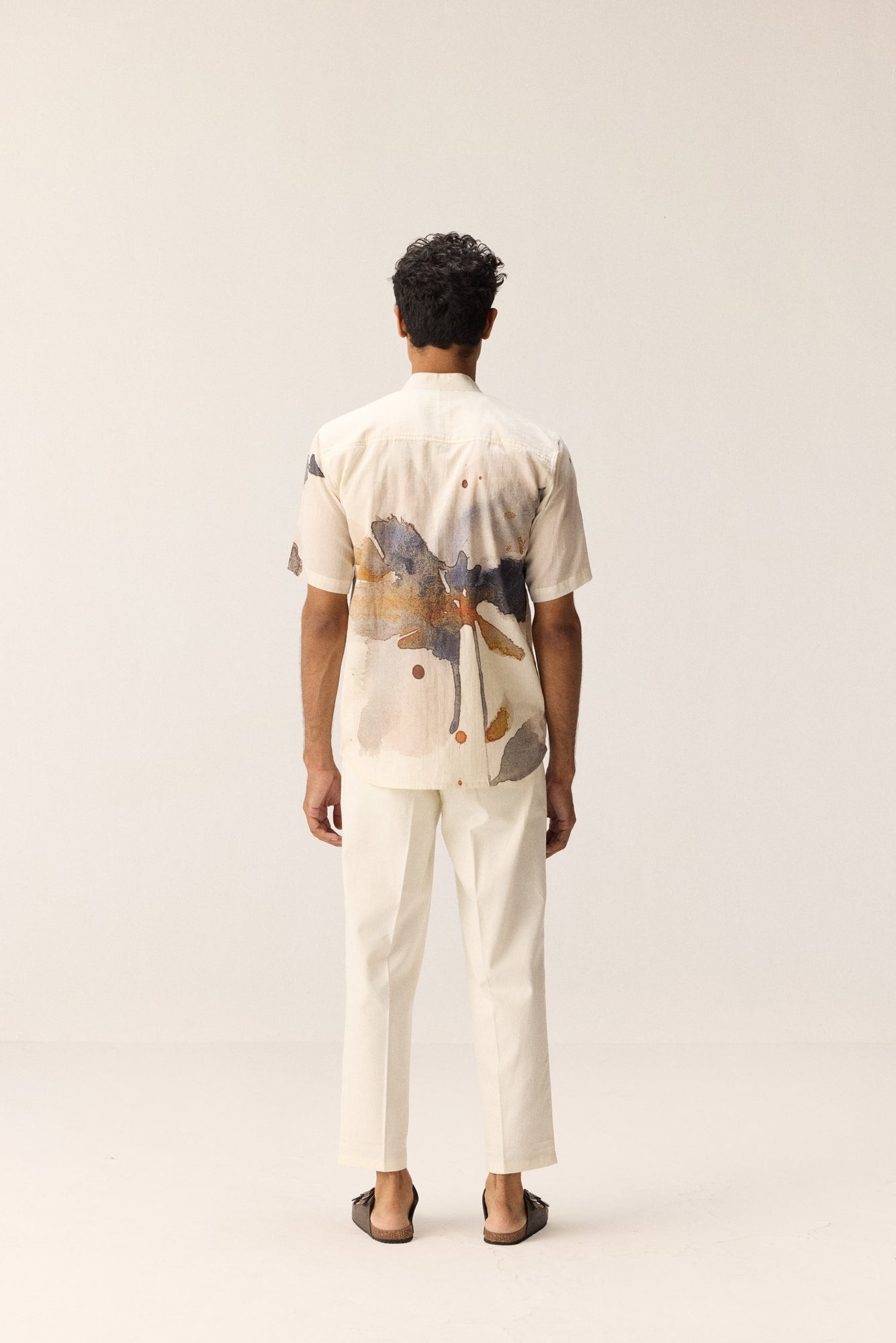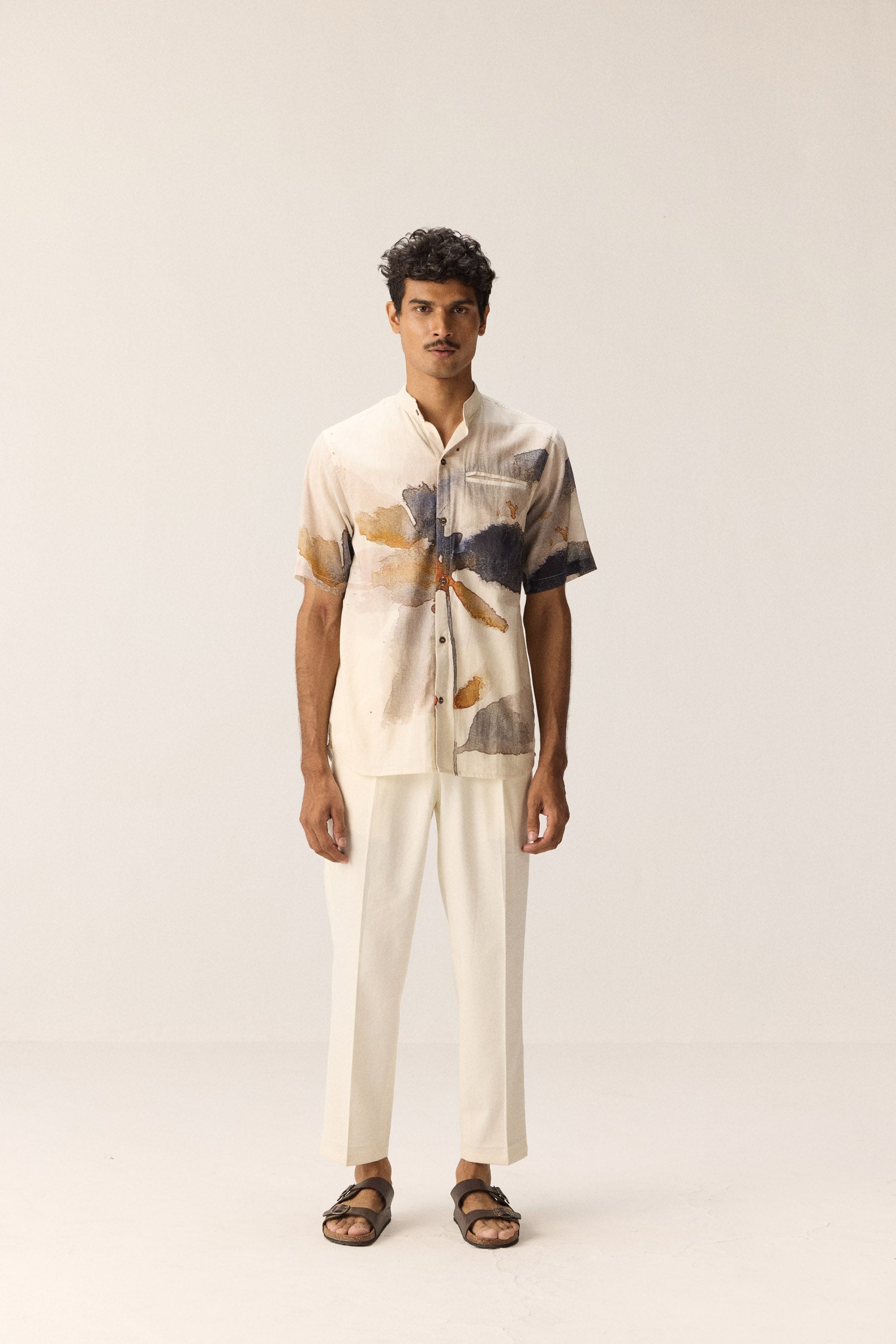 This men's shirt is crafted from soft, breathable cotton mul fabric, featuring a white base adorned with burnt orange and blue floral prints. It includes a front pocket and a Chinese collar, offering a relaxed fit suitable for various occasions.