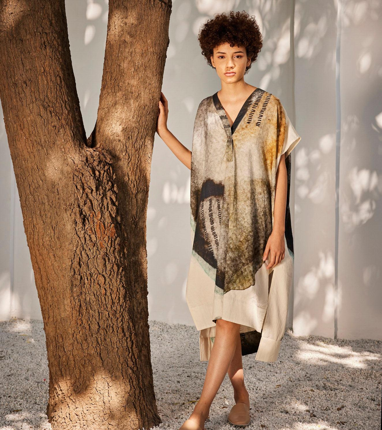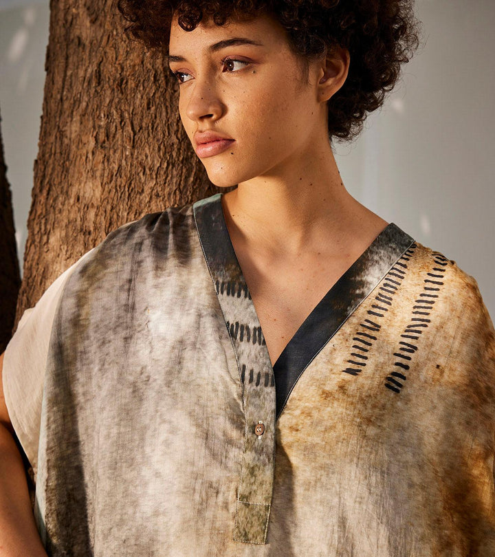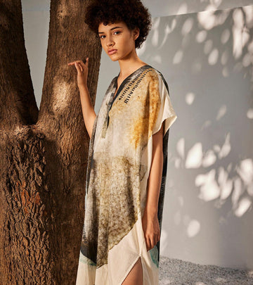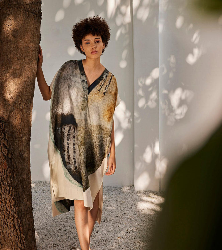 An off-white mulmul cotton kaftan dress with a front button opening, side slit and gathers at the shoulder.