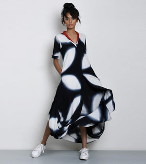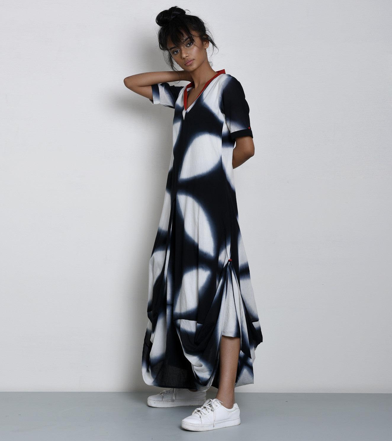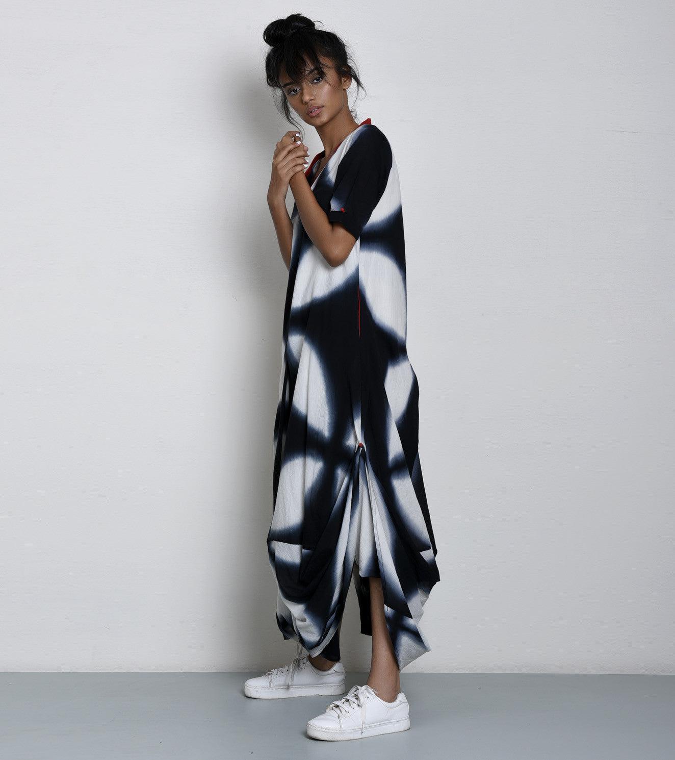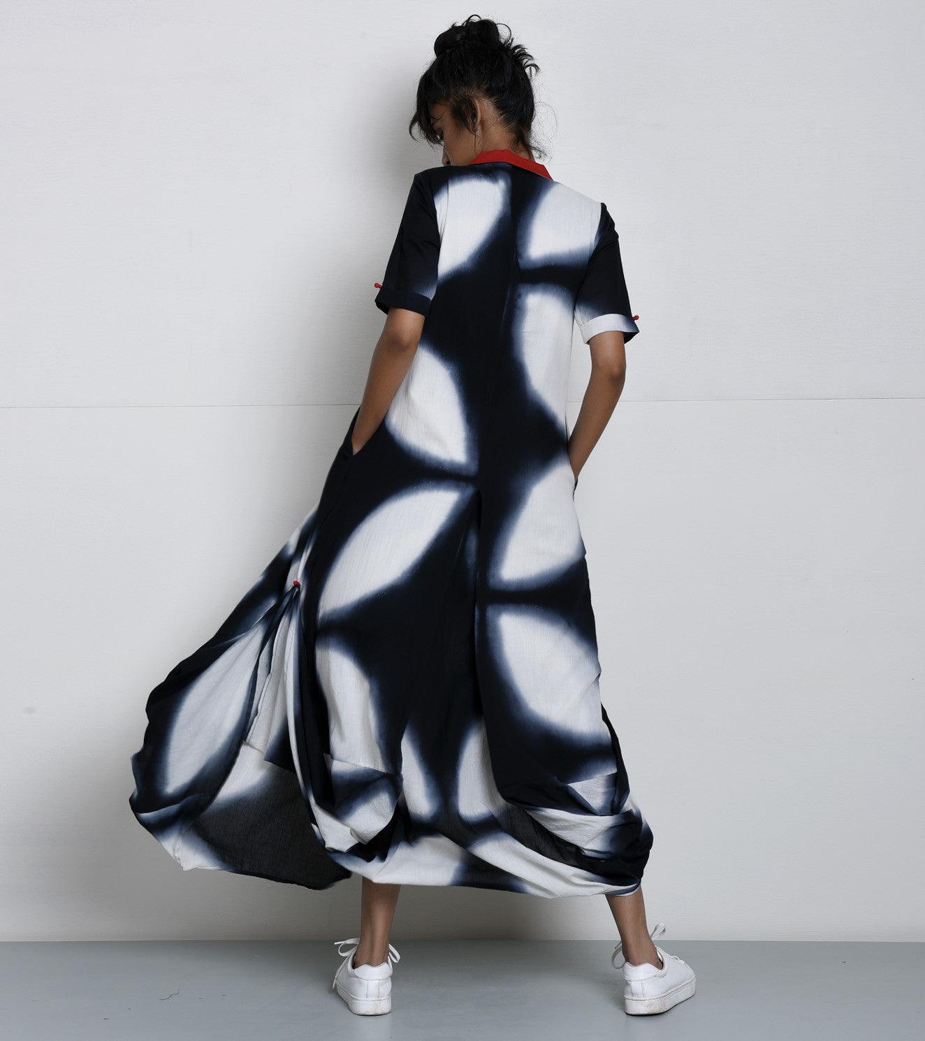 When the rain stops, sometimes all I want to do is lie on the highest terrace top in this city and gaze at the clouds. A black and white shibori dyed, handloom cotton maxi dress in our signature silhouette. Features a red collar panel and red button detailing with side tucks and side pockets for dreamy weather.